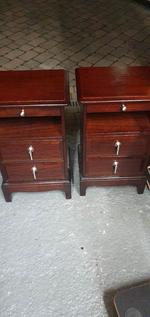 A pair of stag minstrel tall and narrow bedside tables suitable for upcycling