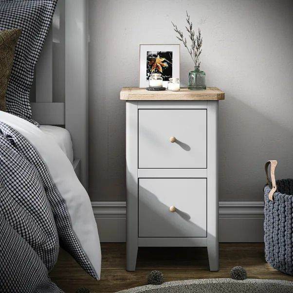 THIS SLIMLINE BEDSIDE CABINET IS BUILT FROM SOLID PINE AND OAK VENEER, PAINTED FINISH WITH A WAXED OAK EFFECT TOP, 2 DRAWERS AND ROUNDED WOODEN HANDLES