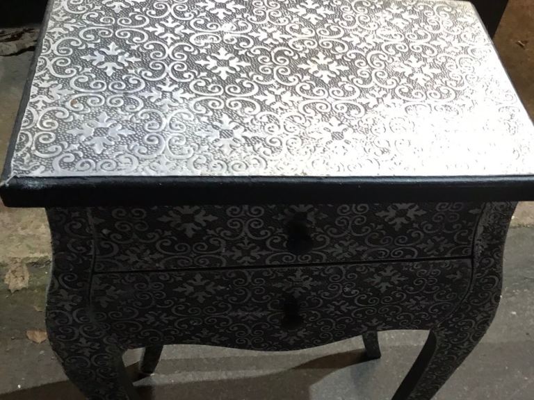 Bedside drawers. black and silver embossed. lovely furniture. possible local delivery 30 pounds. SEE MATCHING FURNITURE.