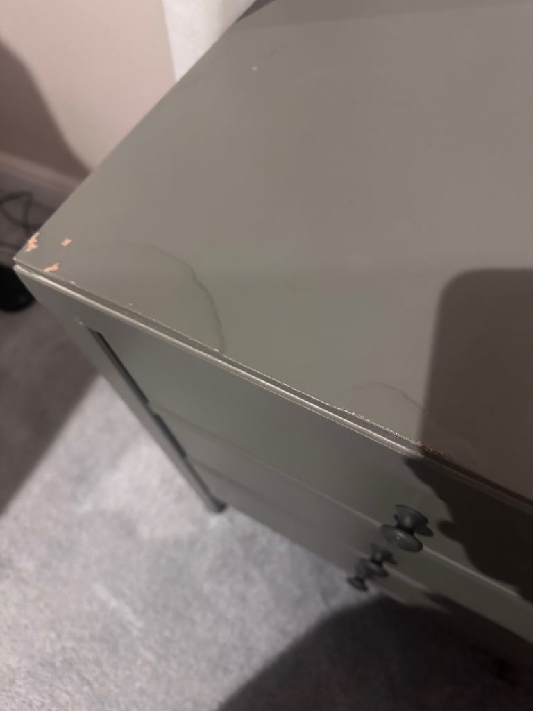 Please note: there is damage to the top surface where the material has swollen/warped, as well as some paint chips and marks on the edges (visible in photos). This is cosmetic but noticeable.