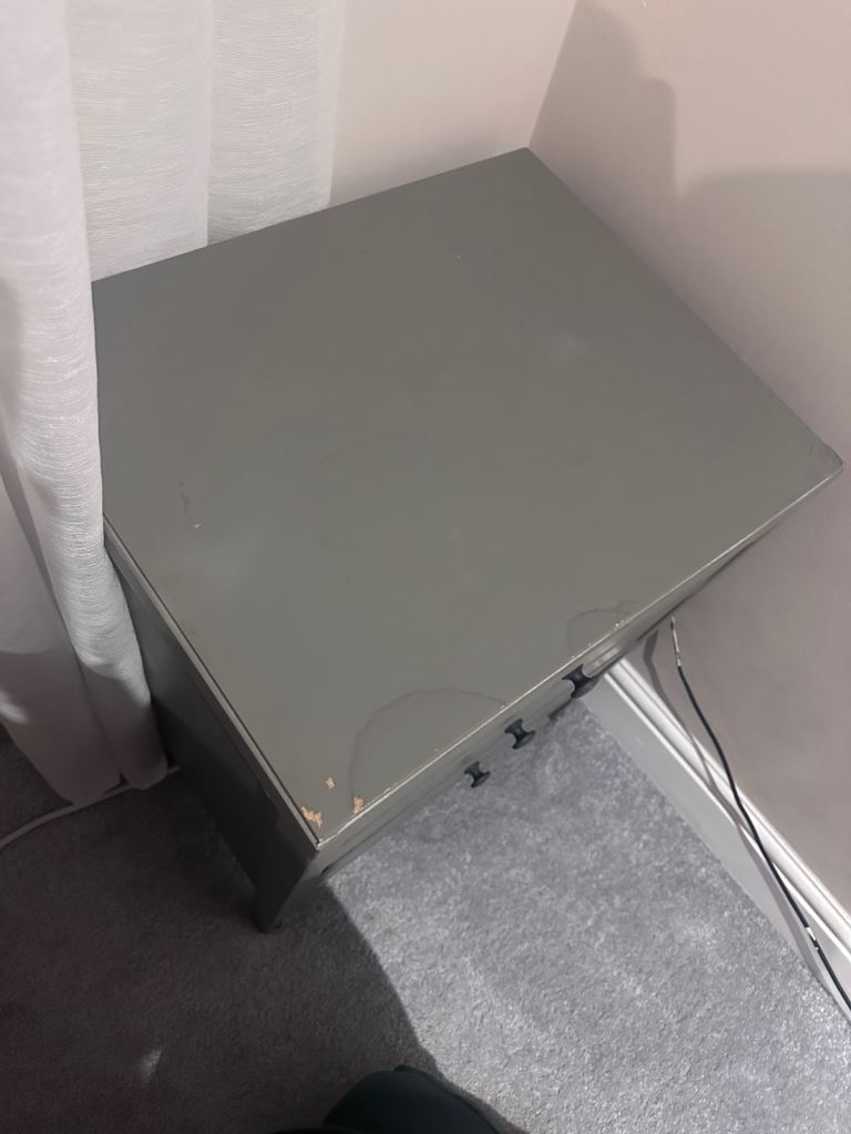Grey bedside table with three drawers in a simple, modern design. Compact size, suitable for a bedroom or small space. Drawers open and close properly, item is stable.