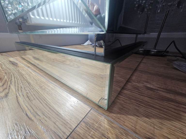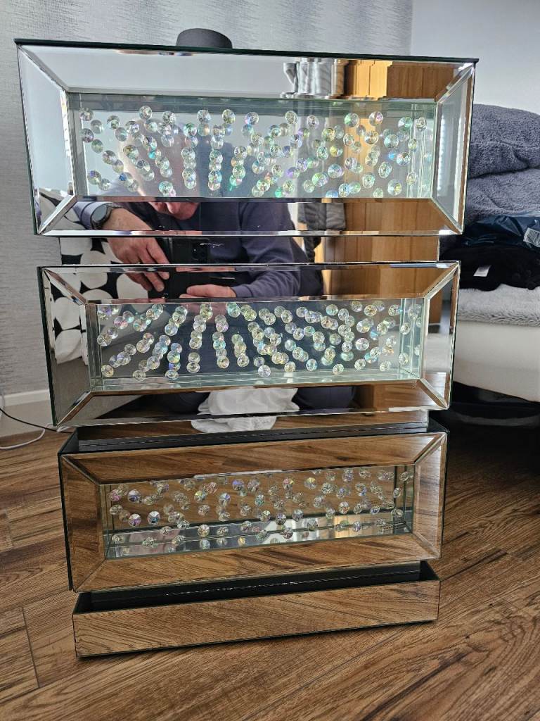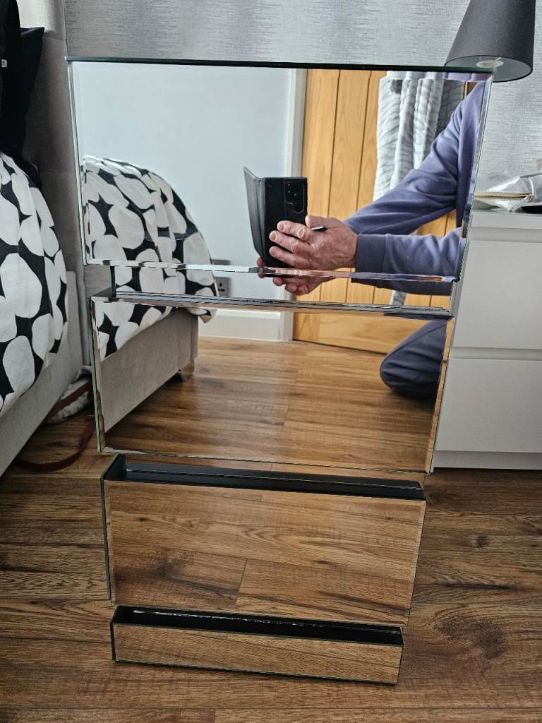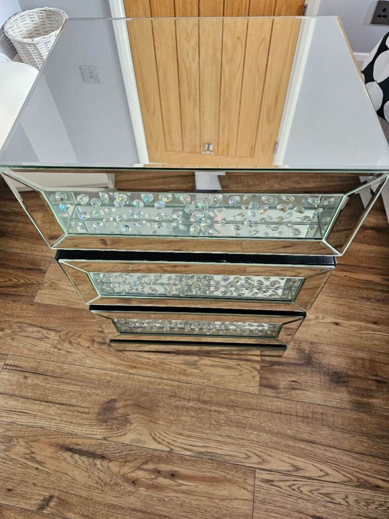 Selling two mirror glass bedside tables with crystals on the front of the 3 draws solid furniture and looks stunning in the bedroom.