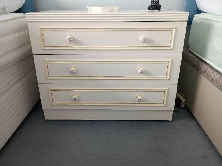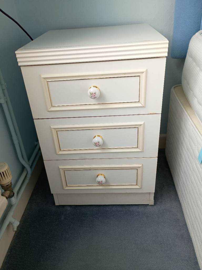 Three drawer unit and two bedside cabinets with three drawers in white. Large 65 cm high x 42 cm deep x 79 cm wide. 2 Bedside drawers 65 cm high x 42 cm deep x 40.5 cm wide Buyer Collects.