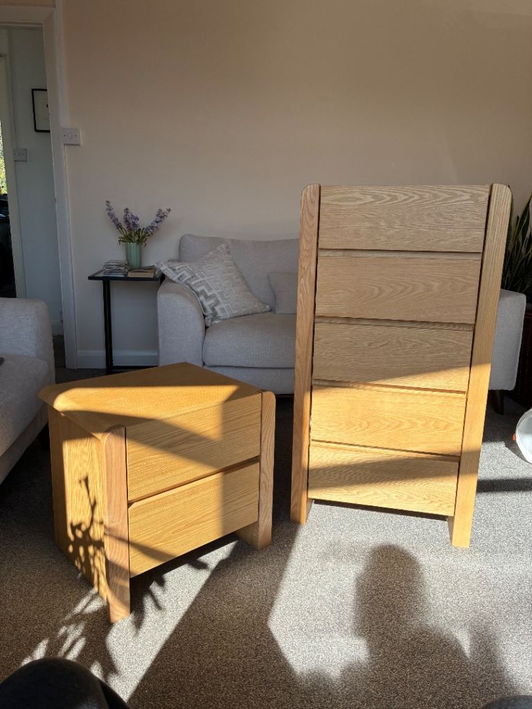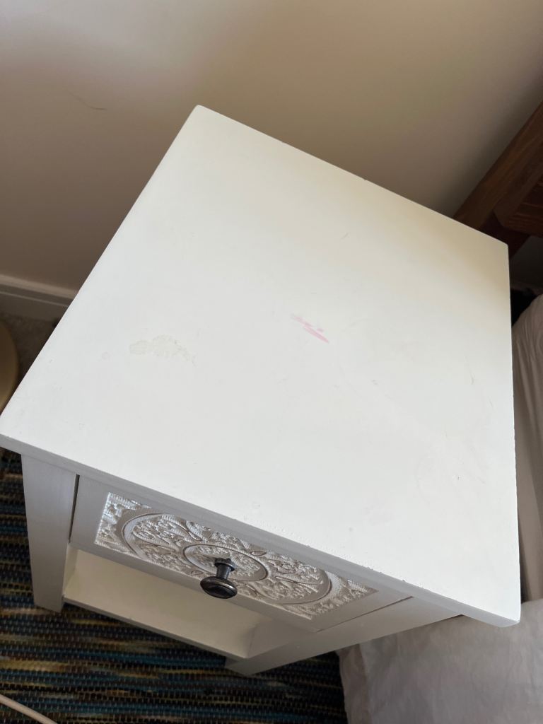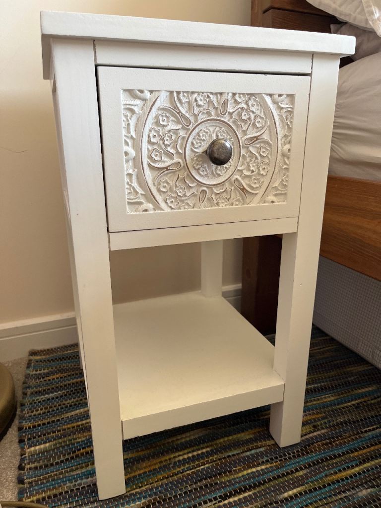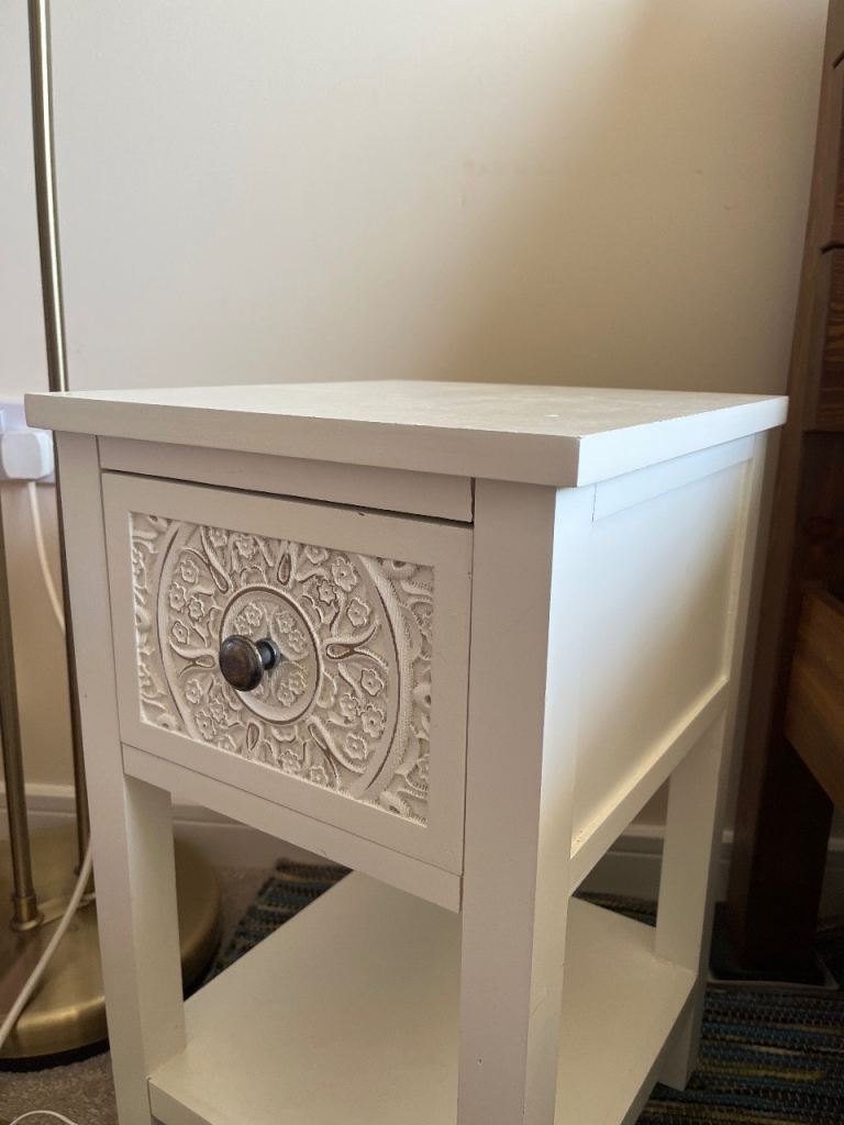 Posting for 1+ yearsDunelm Samira - White Bedside Table with Carved Drawer Front – Good Condition