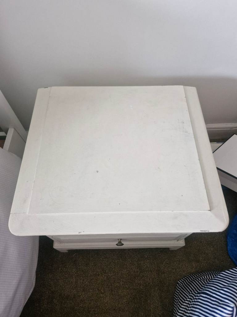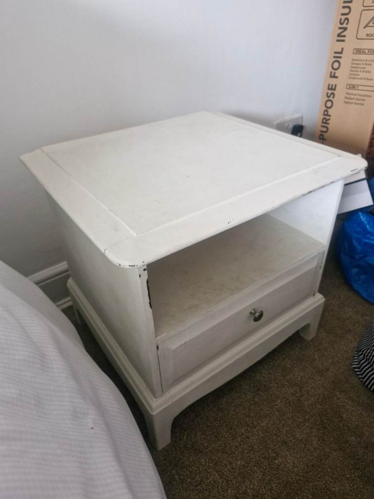Posting for 10+ yearsHeavy solid wood white shabby chic bedside unit