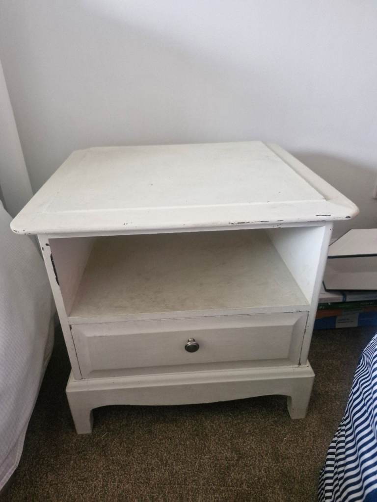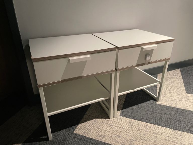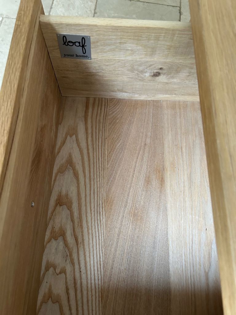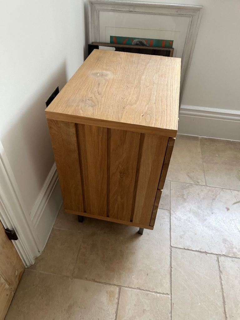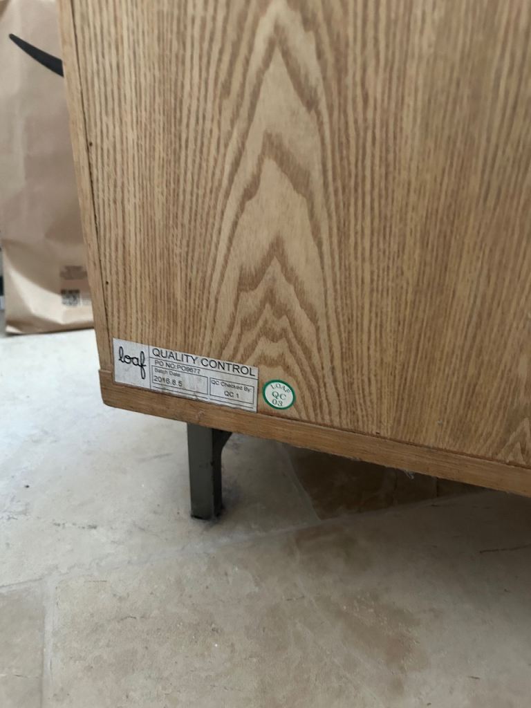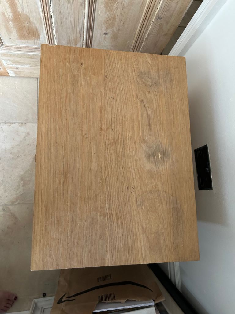 Loaf side table - top has been well loved and could do with some refinishing otherwise good kit. Very solid, metal legs. Very heavy