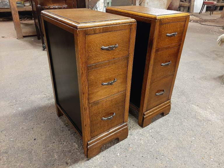 Lovely pair of Art Deco Oak Bedside Cabinets in Excellent Condition , all drawers run nice and smooth , polished black sides which gives them a nice contrast , not very often you find a pair as nice as these , they measure 30 cm x 45 cm x 72 cm tall. Delivery can be arranged