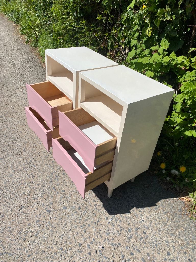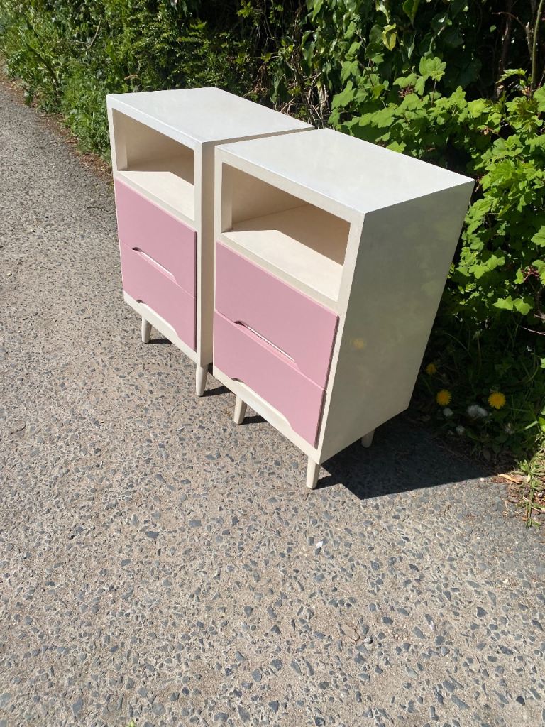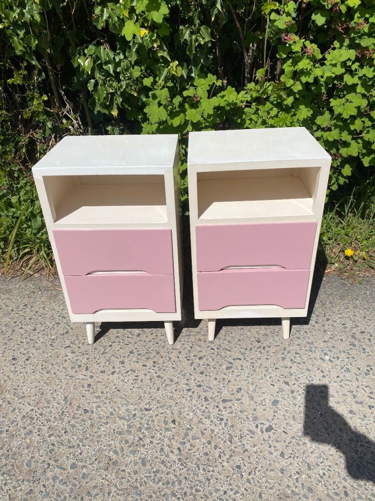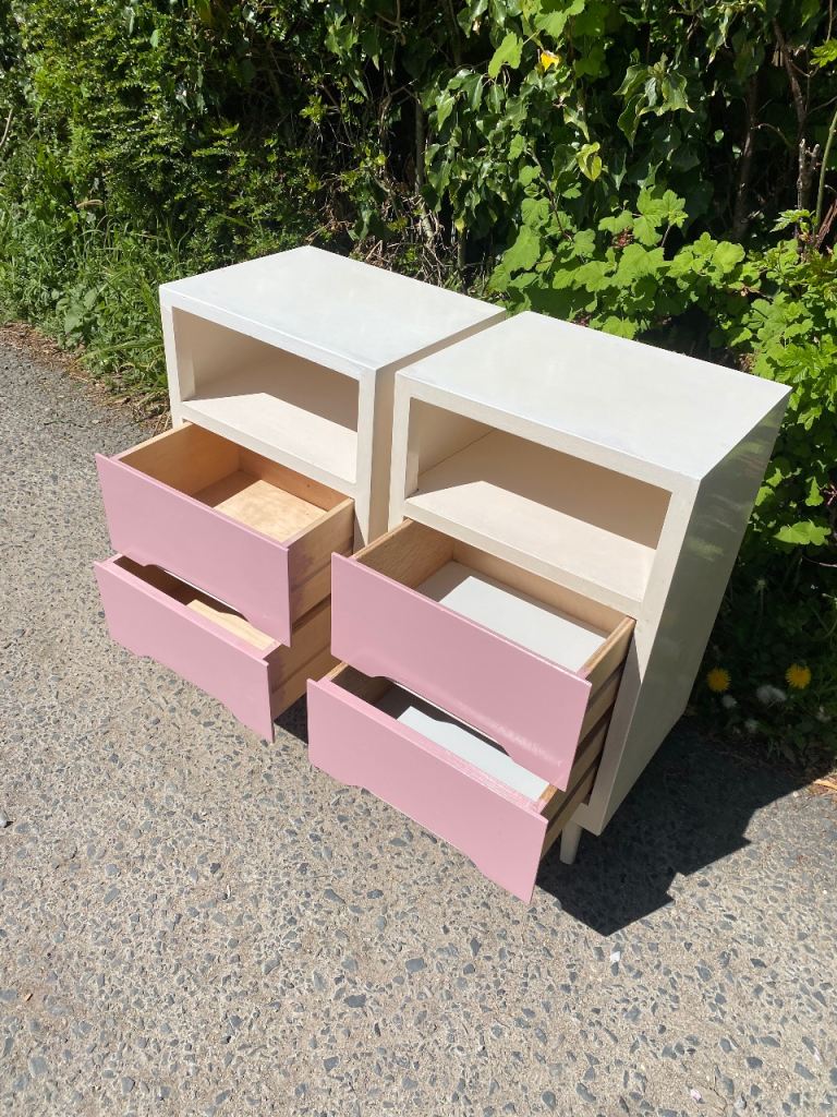 Matching Pair of Painted Wooden Mid Century Bedside Tables…still in perfect structural condition…both really solid and sturdy so can take lots of weight if wanted..all drawers slide still like new and all were covered with paper which I’ve taken out so their all spotless inside.