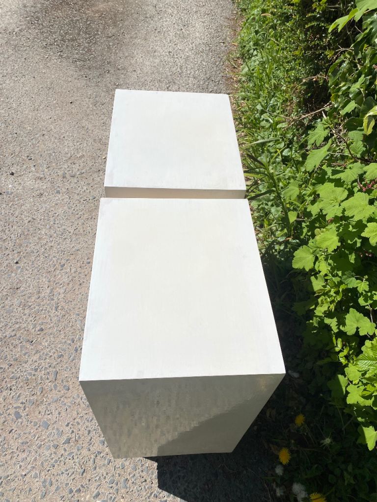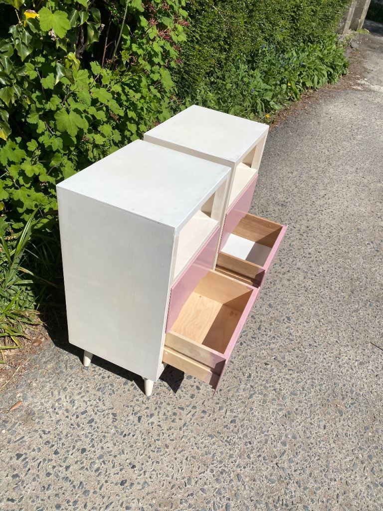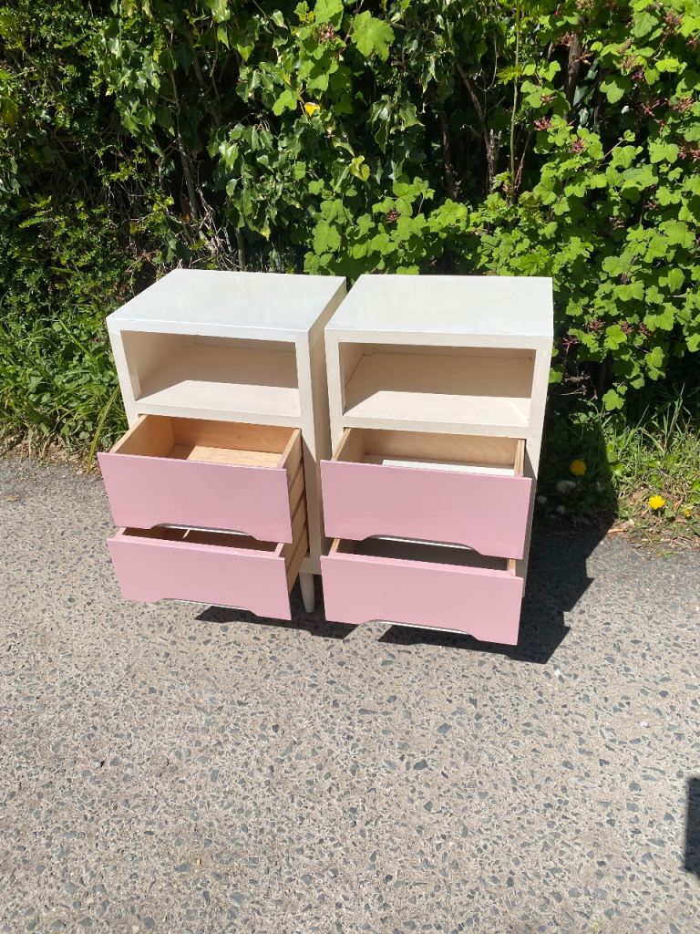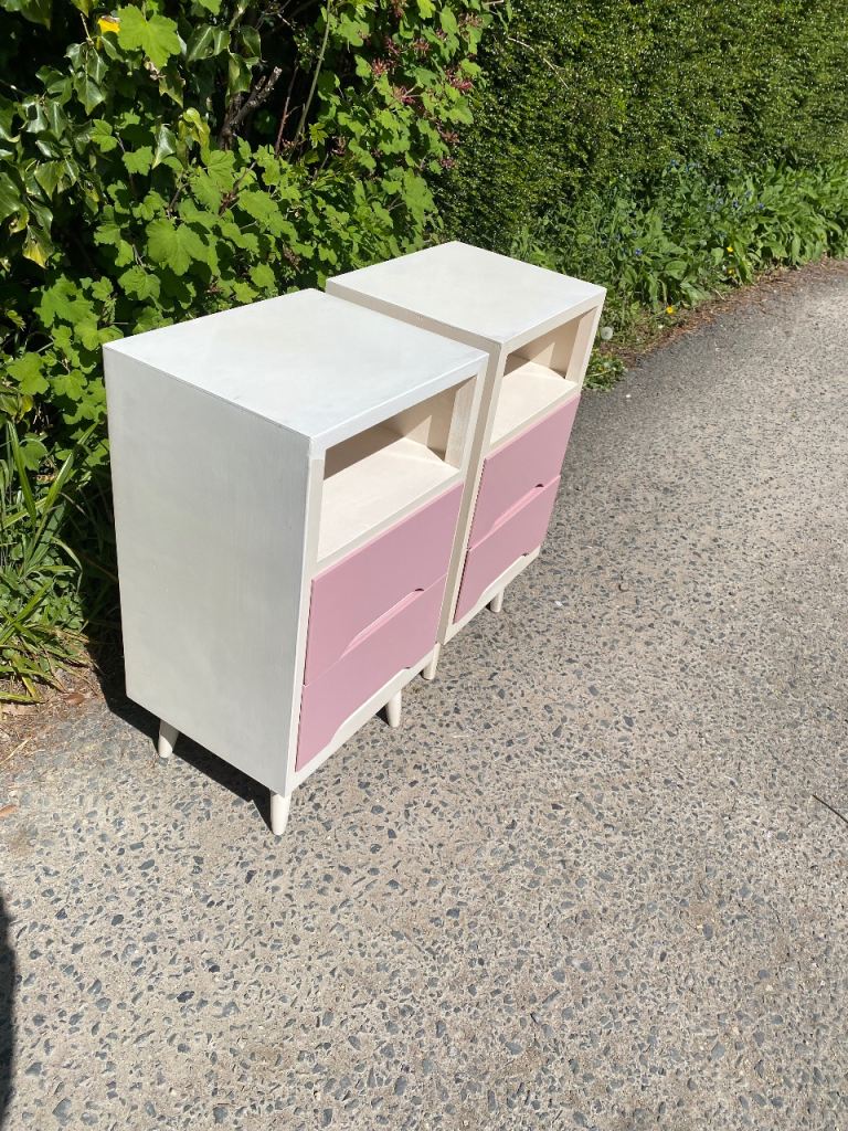 Matching Pair of Painted Wooden Mid Century Bedside Tables…still in perfect structural condition…both really solid and sturdy so can take lots of weight if wanted..all drawers slide still like new and all were covered with paper which I’ve taken out so their all spotless inside.