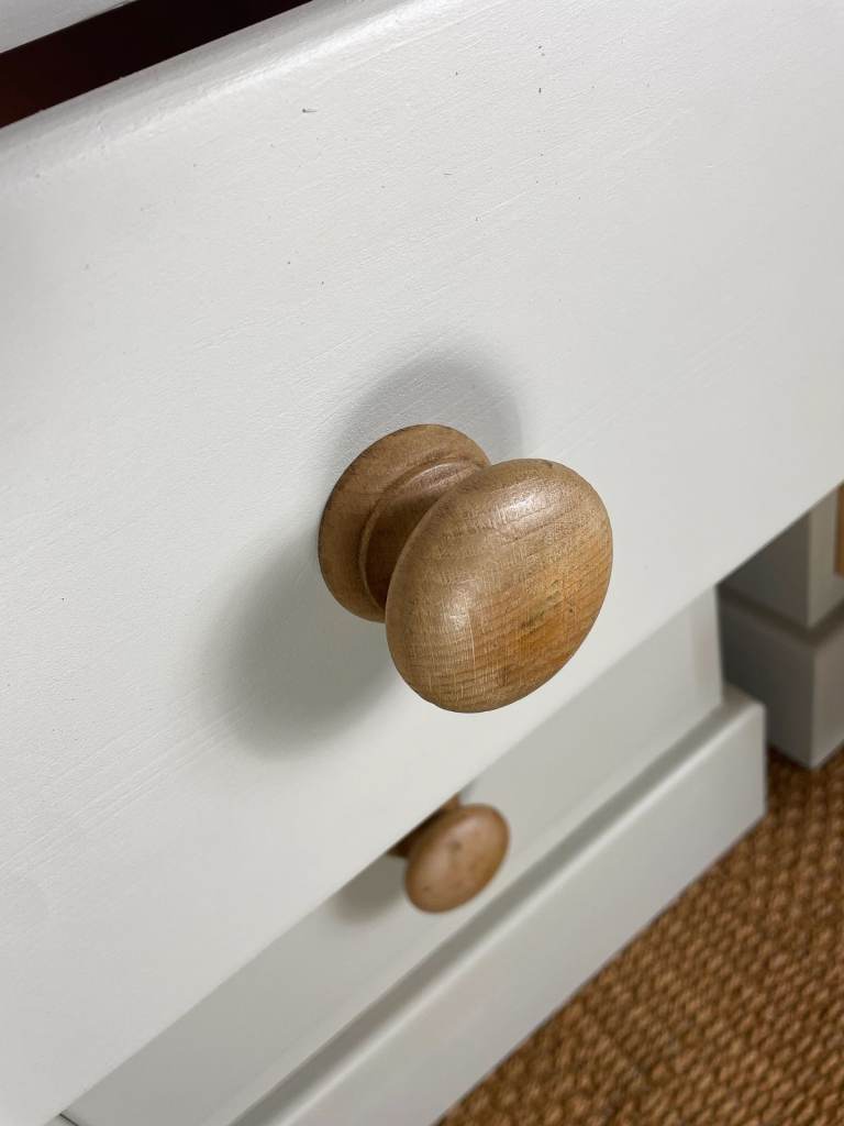 Over sized wooden bun knobs (can be change to cups if preferred to match chest of drawers)
