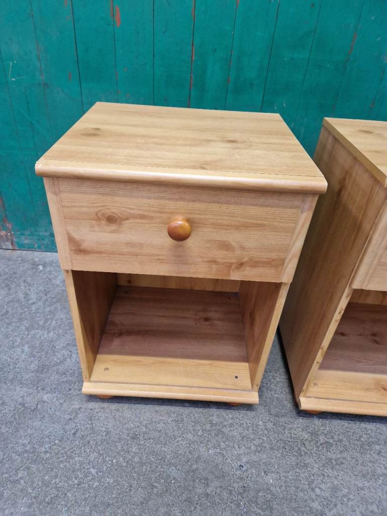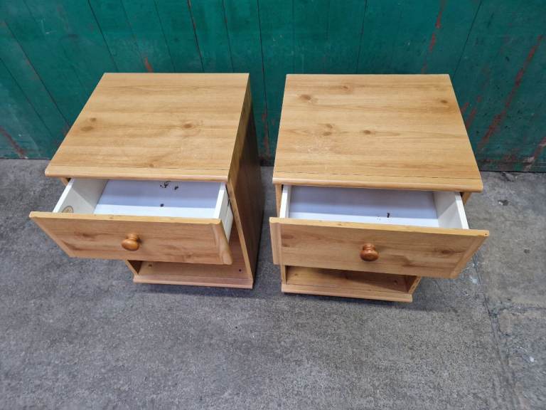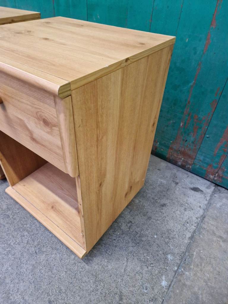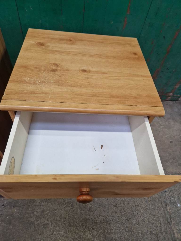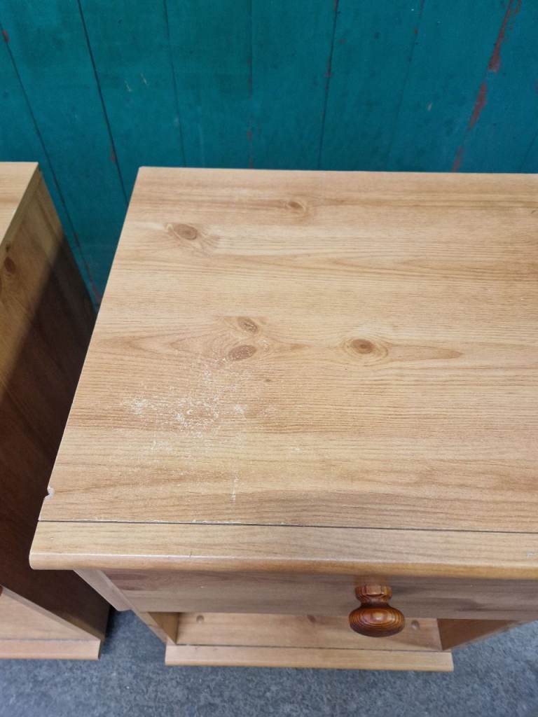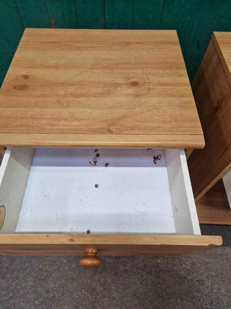 Structurally these bedsides are fine, drawer open and close as should. Not real wood and there is a little bit of wear to the vinyl on the top (see pic). Bottom play on the drawers also has some damage in the inside but doesn't effect its use (see pic). Will do someone a turn still.