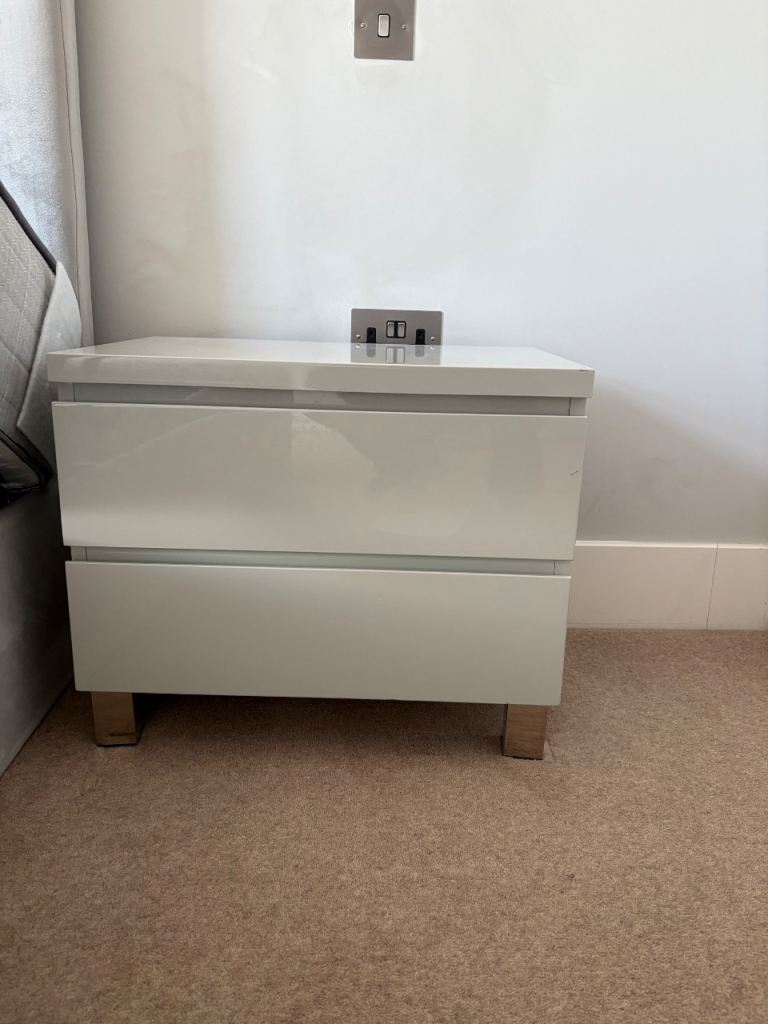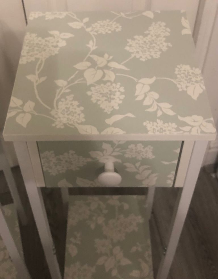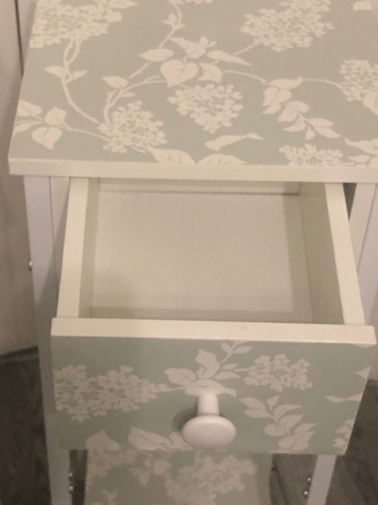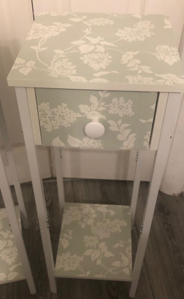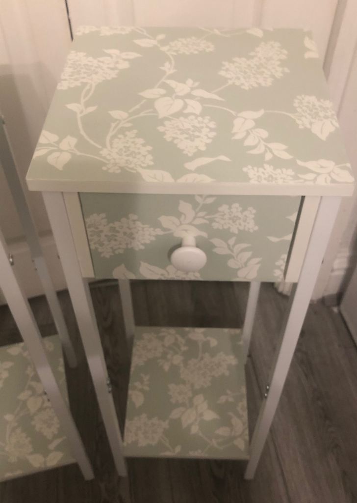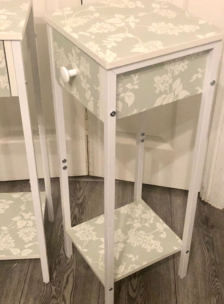 Pair of narrow, tall, bedside tables. Metal base and melamine. Have been decoupaged in a pretty Laura Ashley Print. Varnished for protection.