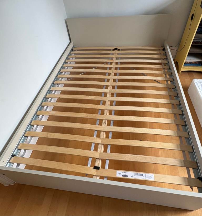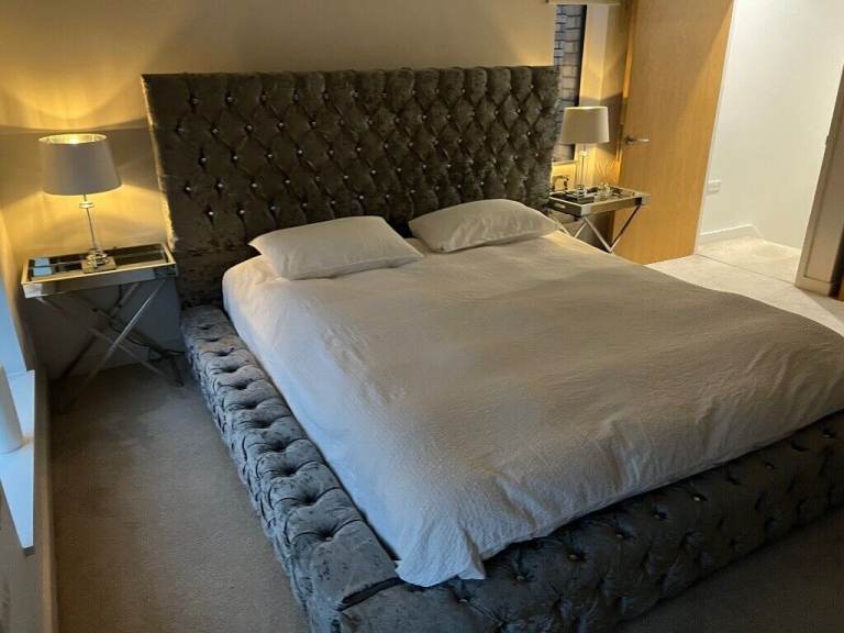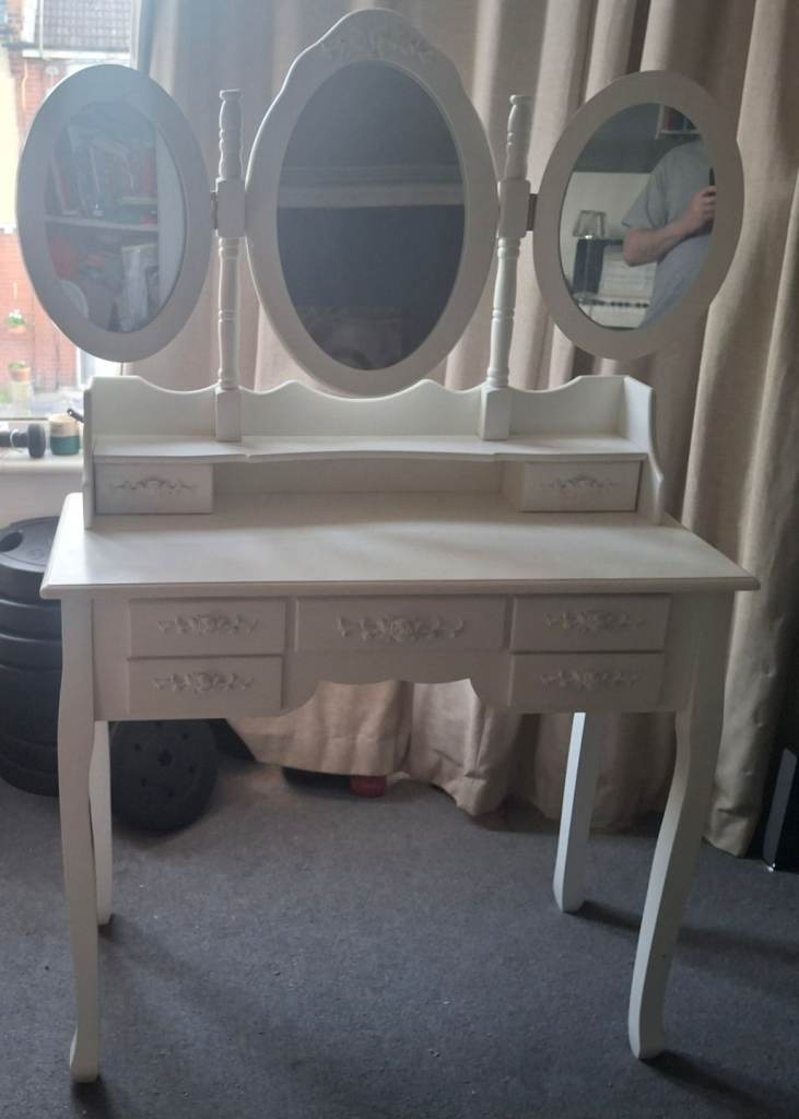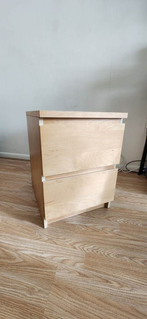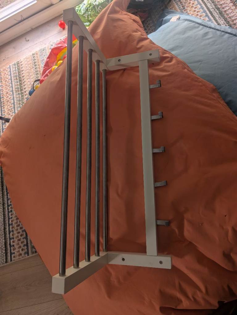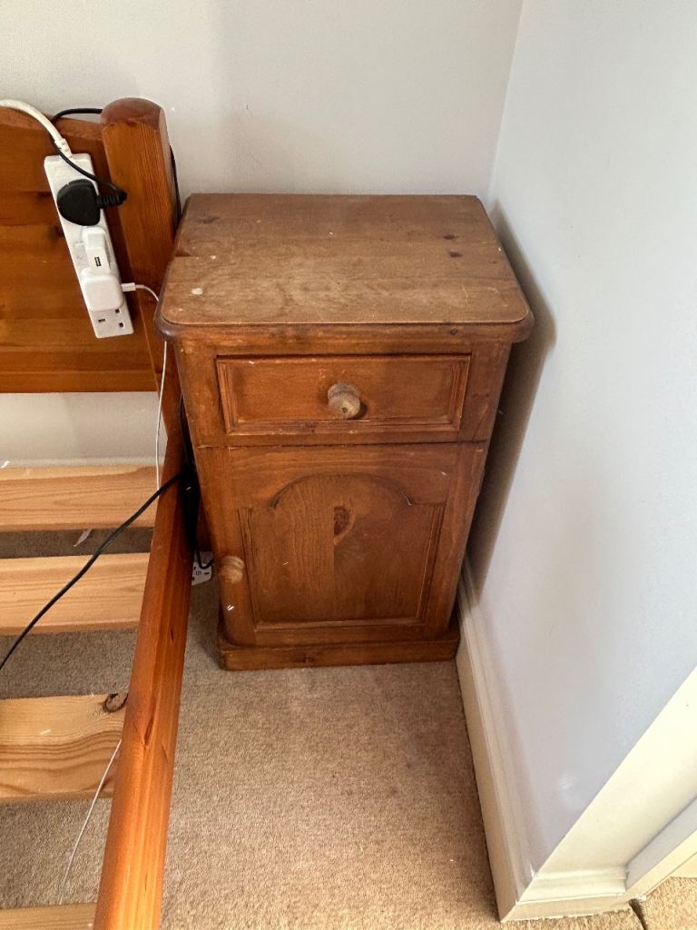 Pair of narrow, tall, bedside tables. Metal base and melamine. Have been decoupaged in a pretty Laura Ashley Print. Varnished for protection.