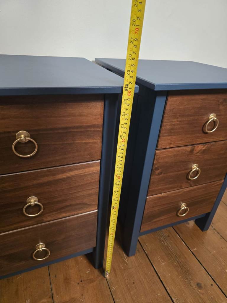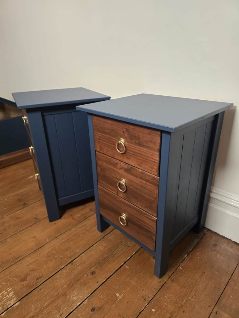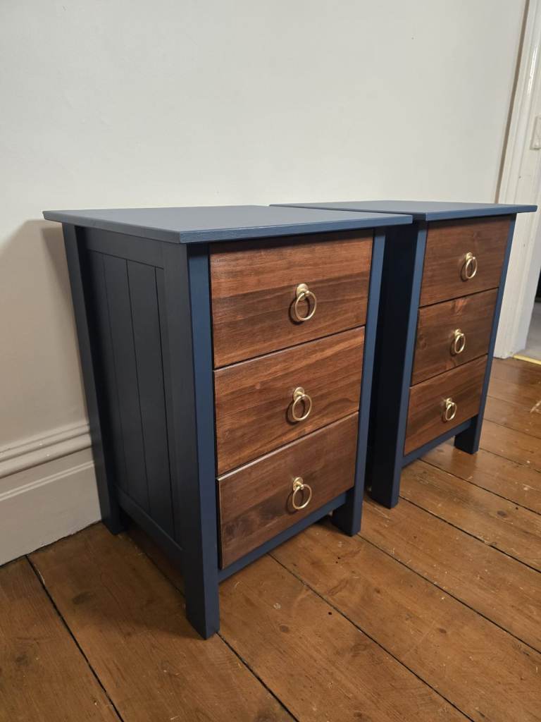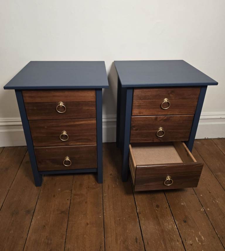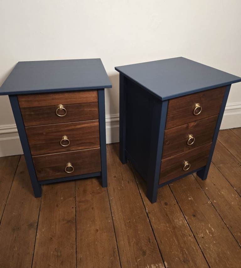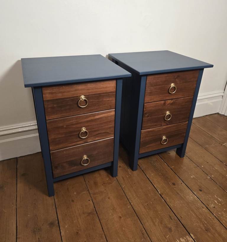 Lovely matching pair of refurbished bedside tables. They’ve been freshly updated with a dark navy painted frame, contrasted with solid wood drawers stained in a warm walnut finish. Finished off with simple brass drawer pulls for a classic touch.