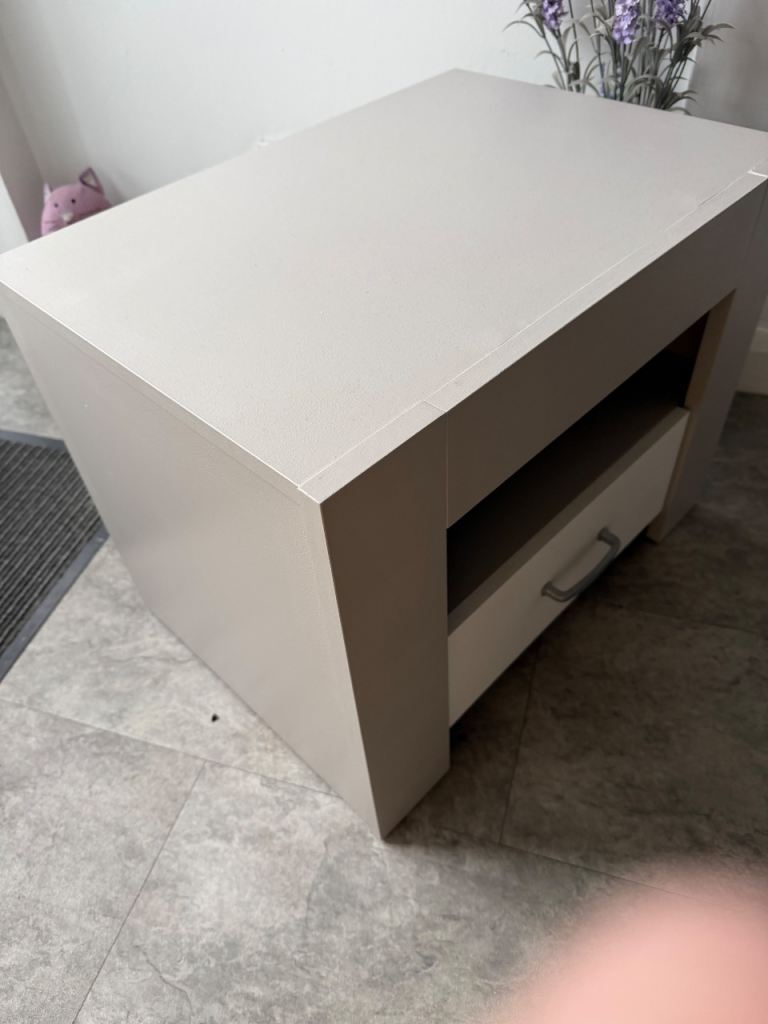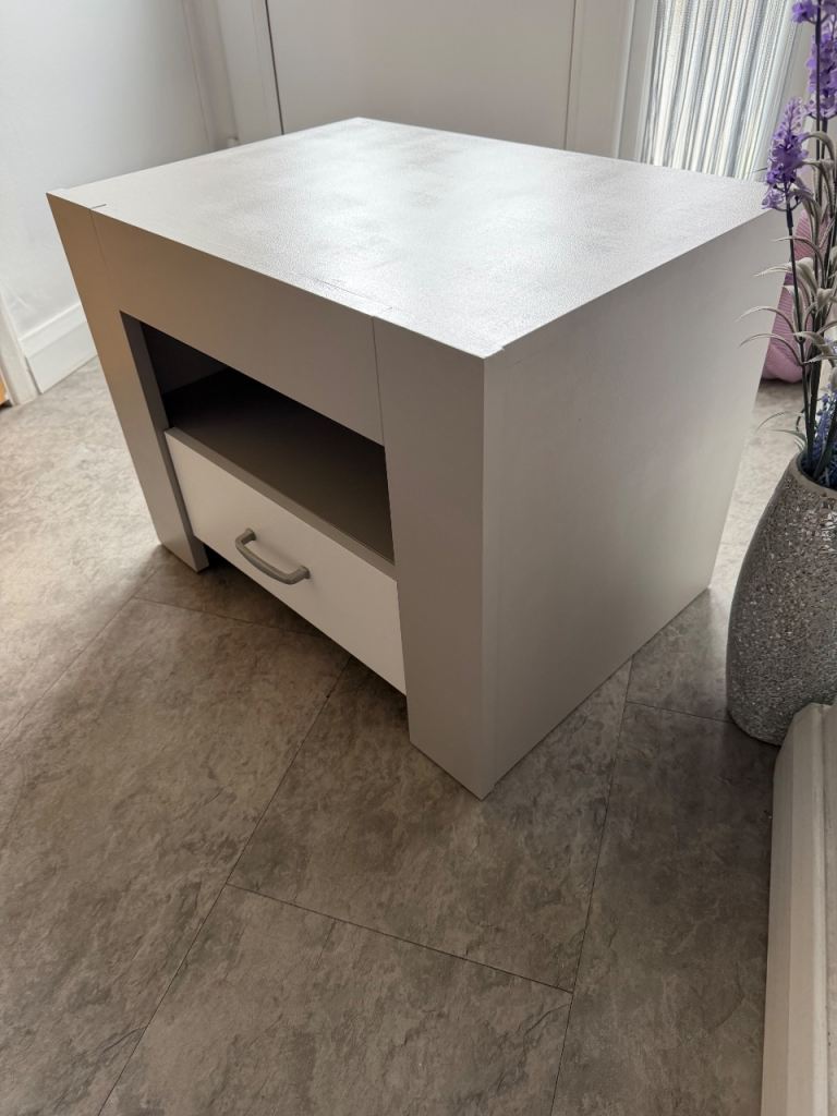Single Bedside Table with deep drawer and shelf. Grey & White with Chrome Handle. Ideal for Bedroom. W 59 x D 42 x H 45 cm. **Slight watermark on top, reflected in price** £15.00. Collection Wivenhoe