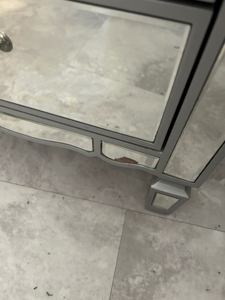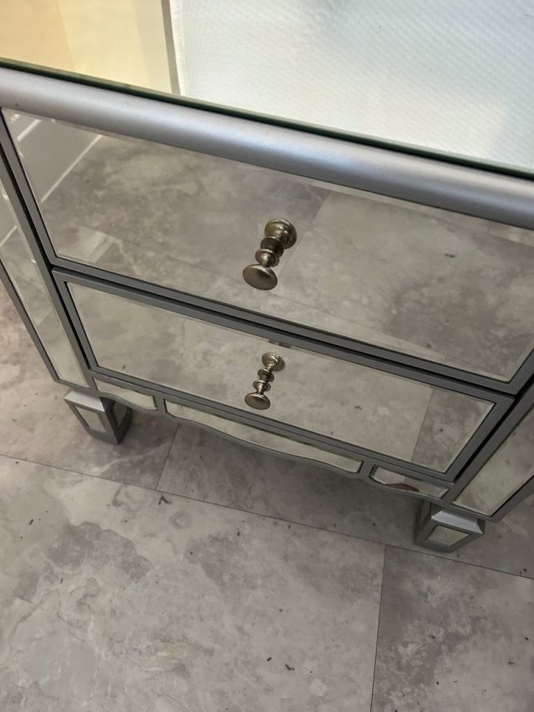 very good condition Lovely mirror effect cabinet-( apart from a slight mark to the base of a drawer .. see photo .. ) 25ins wide and height , 16ins depth