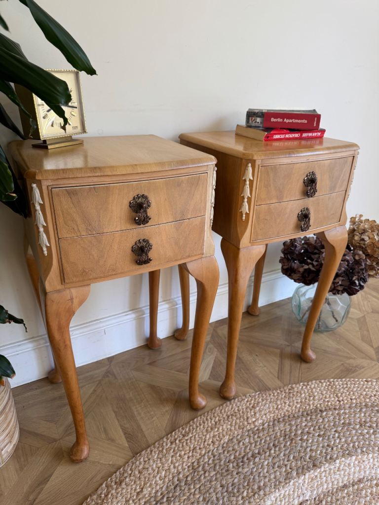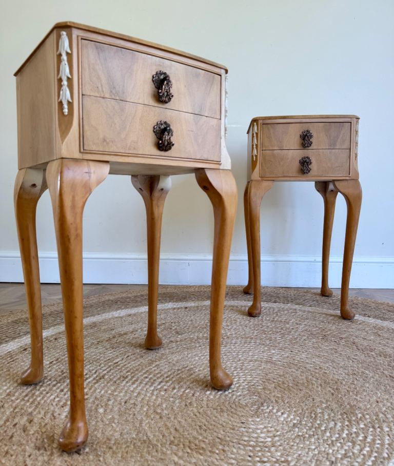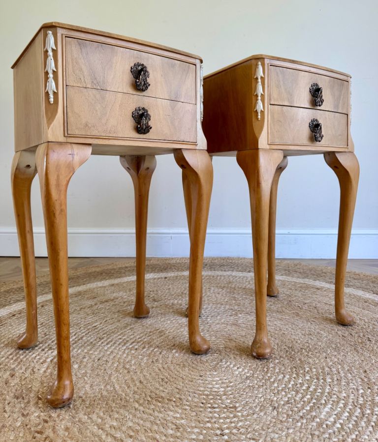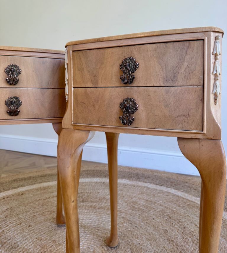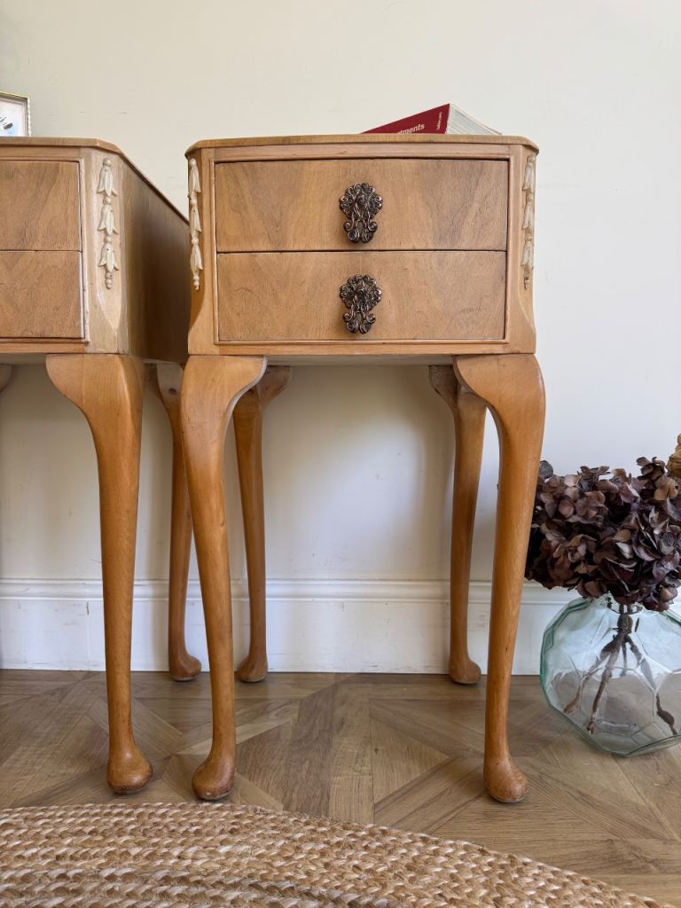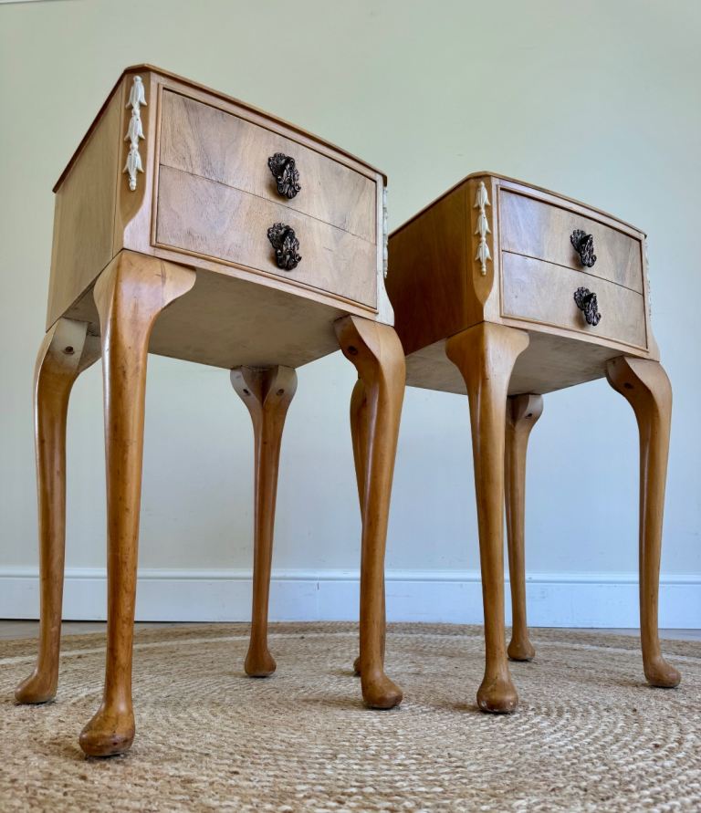 Pair of Vintage early 20th century French style Queen Anne leg bedside light walnut drawer tables