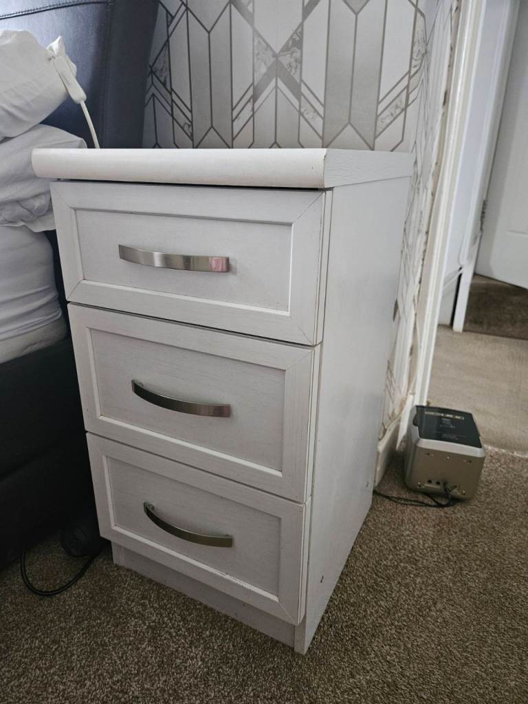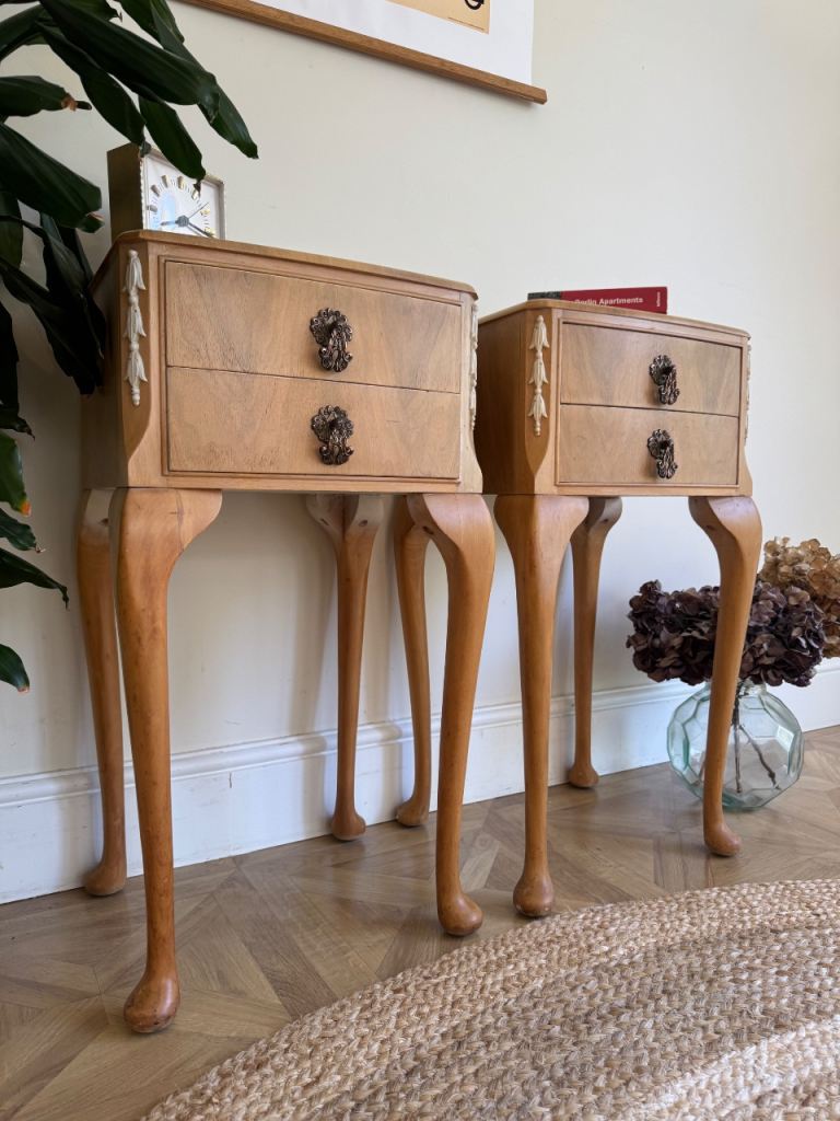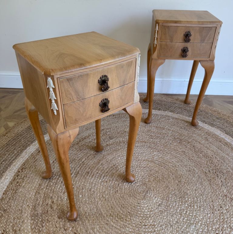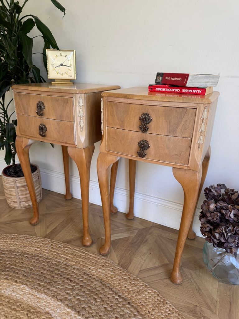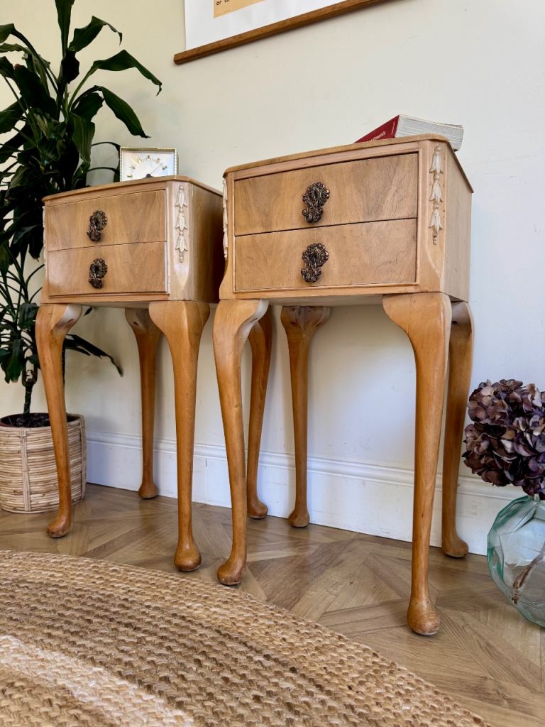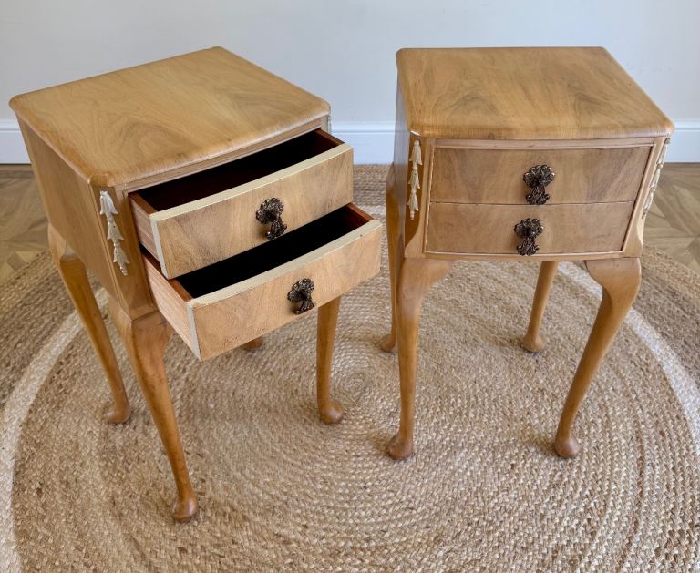 Pair of Vintage early 20th century French style Queen Anne leg bedside light walnut drawer tables