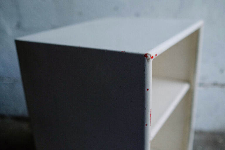 Painted off-white, there are one or two areas where the paint is chipped and its previous red is revealed.