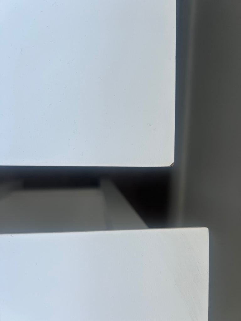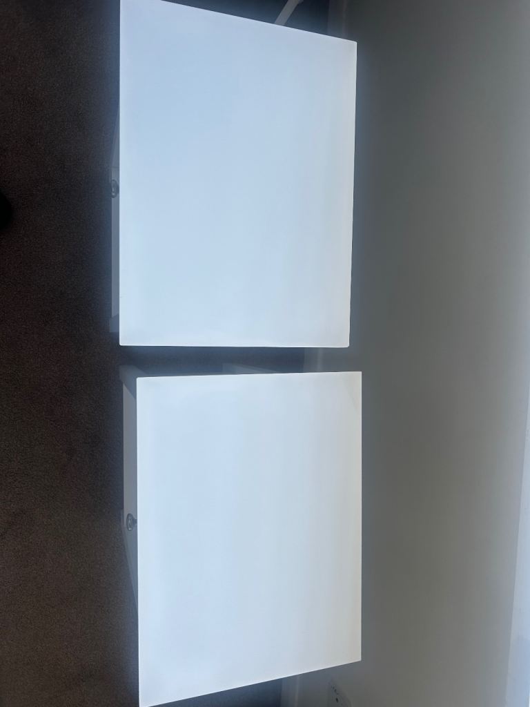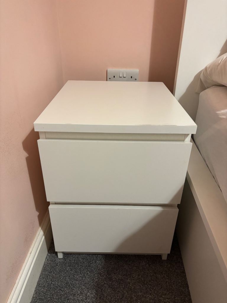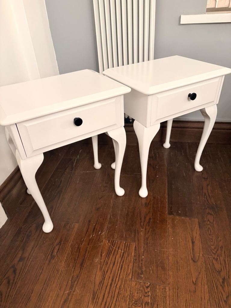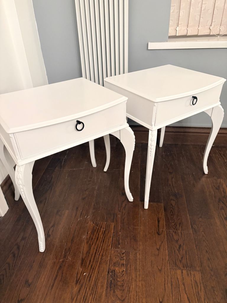 White bedside tables £50 brand new on Wayfair, yours for just £30. Already-assembled and good condition. Tiny corner chip, please see image.