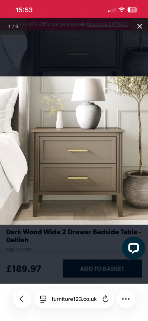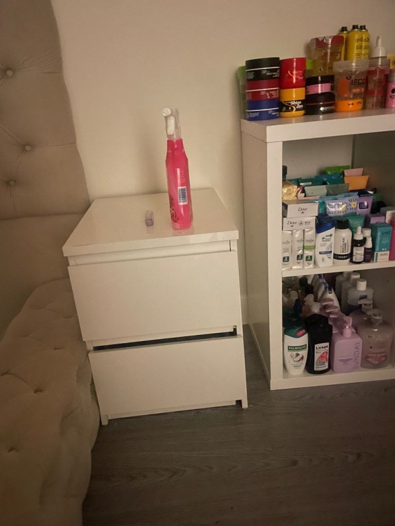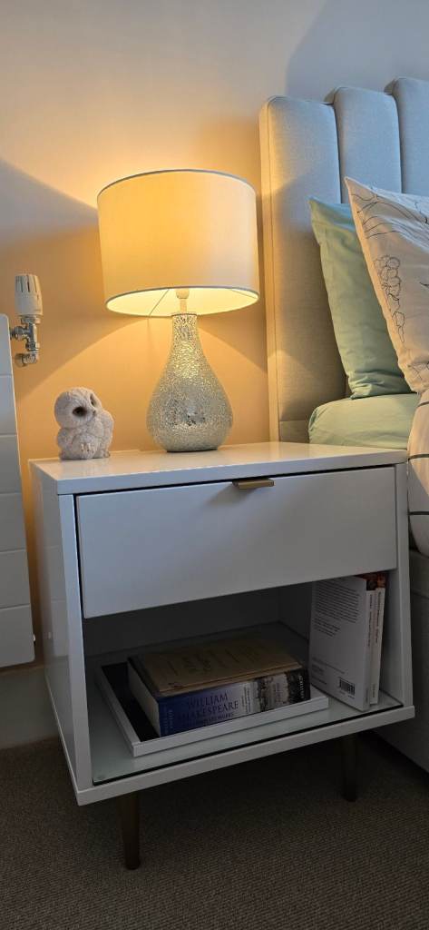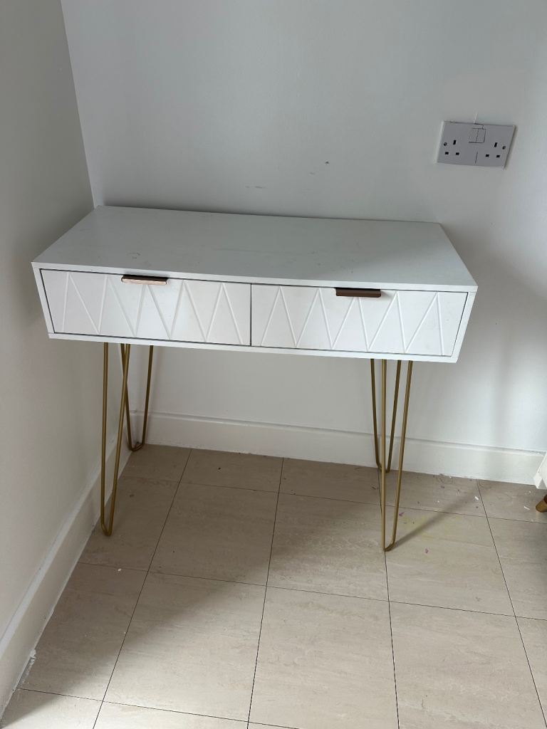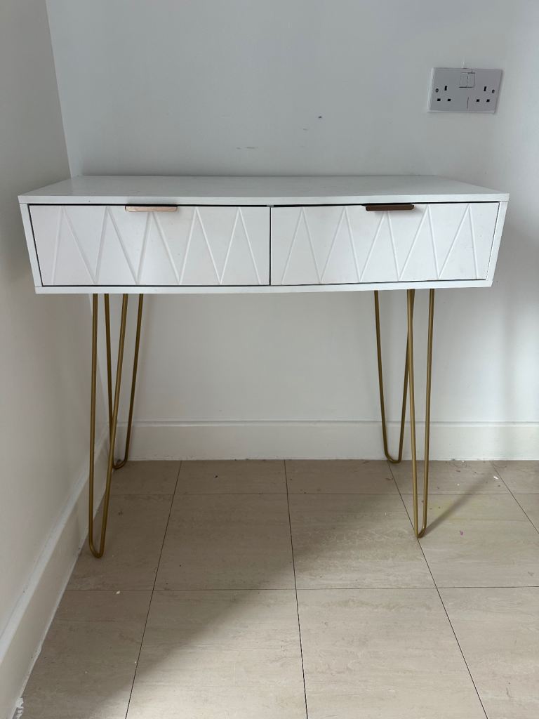 Selling a stylish console table with two drawers and gold hairpin legs.