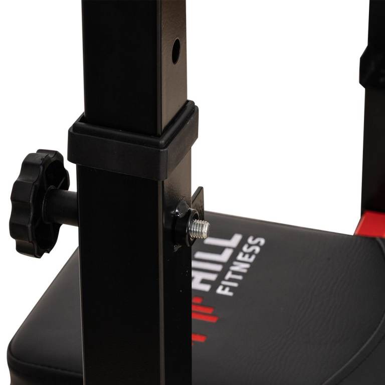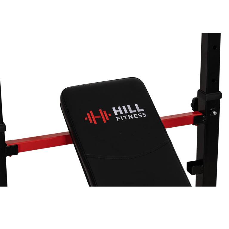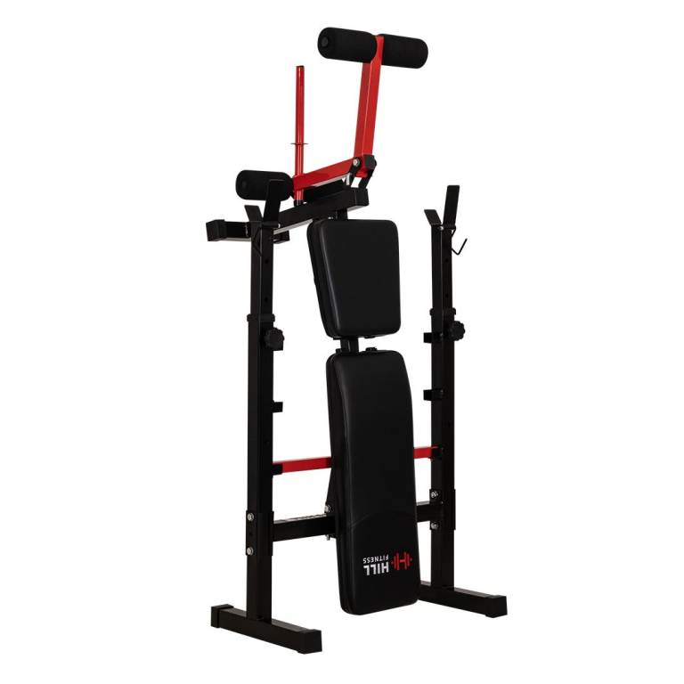 Our Home Series Adjustable Weights Bench is perfect for beginners & home gyms. The bench includes a plate-loaded leg curl/extension attachment, has a fully adjustable backrest/uprights, folds up for easy storage, includes barbell hooks for increased safety when loading your barbell, and even comes with an embroidered Hill Fitness logo & stainless steel logo badge.