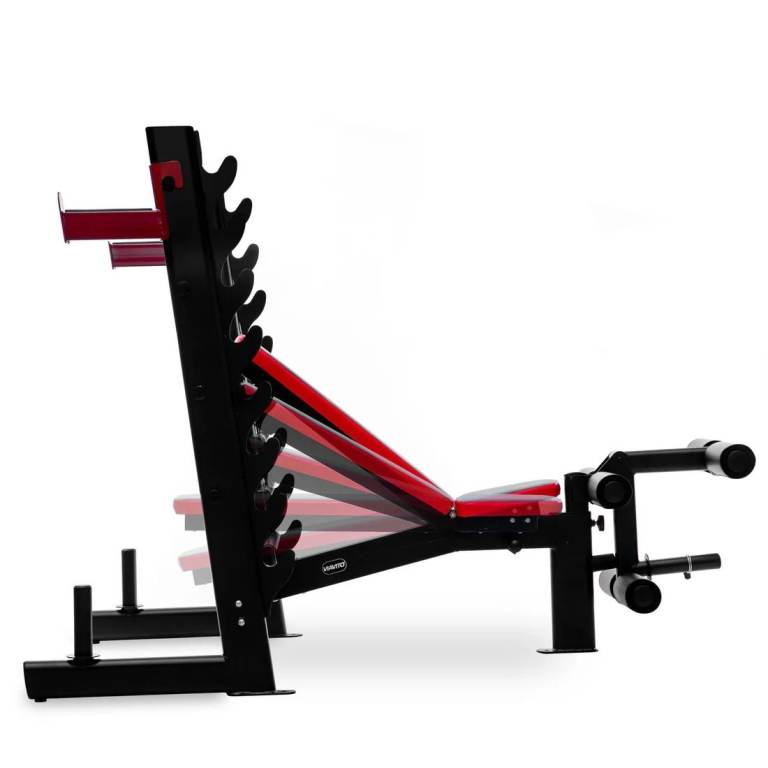 There is also a padded total leg developer with 6 foam rollers enabling you to target glutes, hamstrings, and quadriceps muscles for superior leg results. The unique Akimbo style uprights with serrated bar catchers allow for quick bar height adjustment and help you safely execute those heavy lifts, whilst the rear mounted storage pegs ensure easy storage and perfect organization of your Olympic (2”) weight plates. Plus, the Studio Pro boasts adjustable safety spotters for safe and effective squatting. The bench is suitable for a wide variety of exercises such as bench press, incline bench press, decline bench press, concentration curl, lying tricep extension, back row, shoulder press, leg extension, leg curl, and squat.