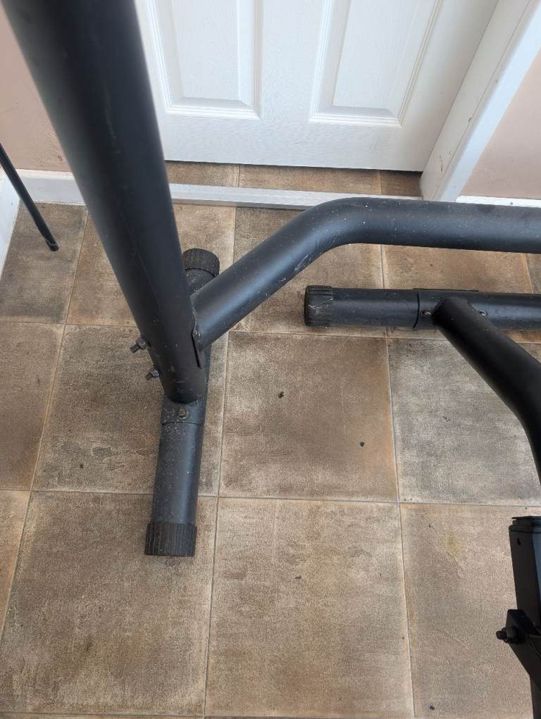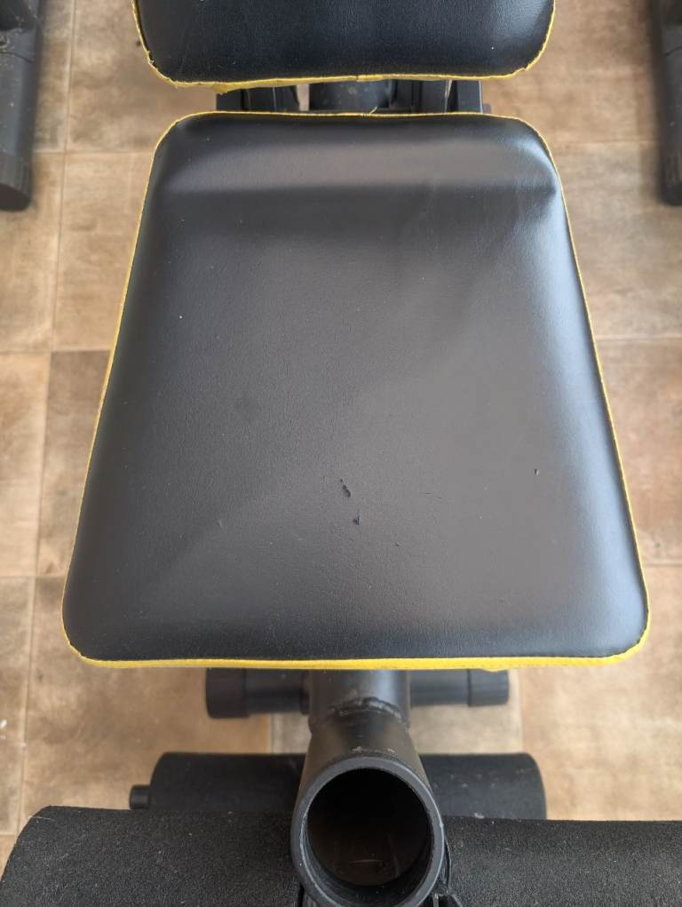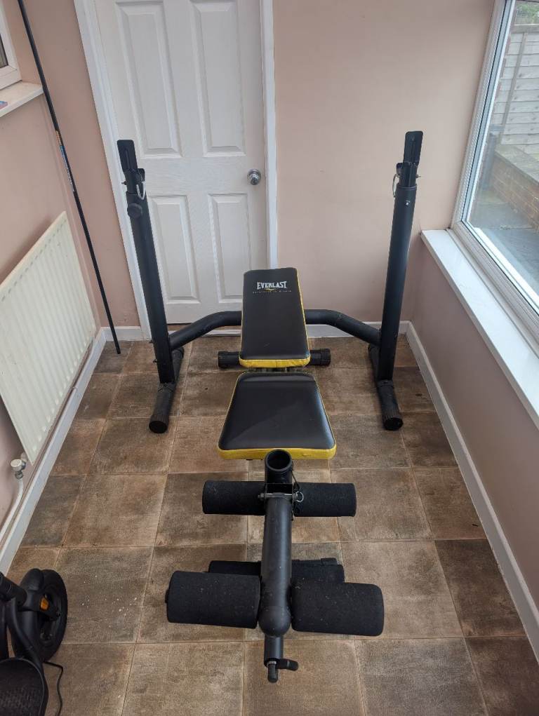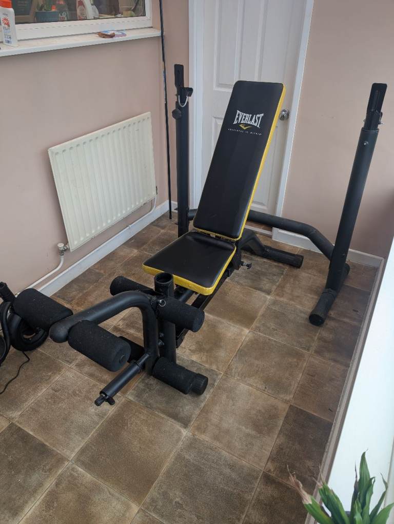 Everlast weight bench with barbell rack in a used but good condition. Some marks and a couple of little cuts on the seat, nothing bad, and come light marks of corrosion and some white flecks on metal frame work. Would clean out fairly easily. Collection only, all breaks down and fits in an estate car.