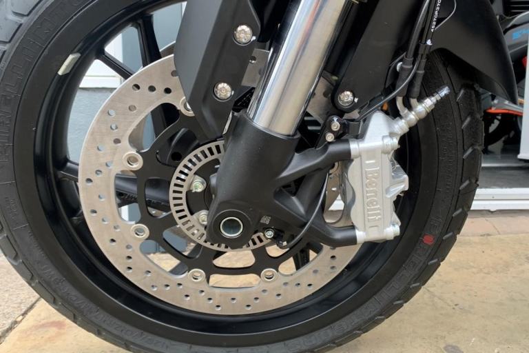 State-of-the-art instrumentation, in TFT, for a dashboard with a modern and authentic design. Marzocchi up-side down fork with 50 mm diameter stems, adjustable in rebound, compression and spring preload, Brembo braking system, a guarantee of maximum safety, with a double semi-floating front disc of 320 mm in diameter and four-piston radial monobloc caliper, and a 260 mm diameter rear disc, with double piston caliper and ABS. 17 ”spoked, tubeless, aluminum alloy rims are fitted with 120 / 70-17 and 180 / 55-17 Pirelli tyres.