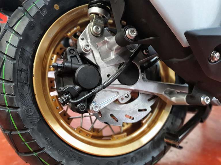Equipped with 14” front and 13” rear spoked wheels wrapped in CST dual-purpose tires (110/80-14 and 130/70-13)