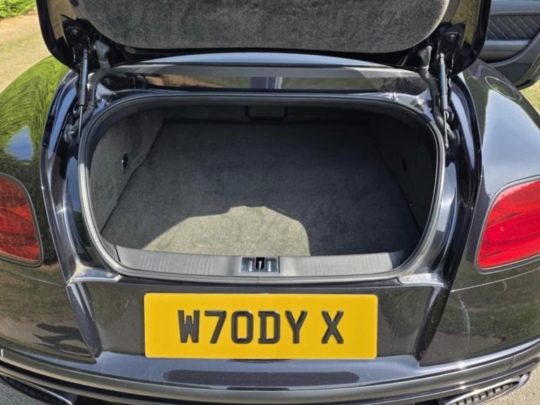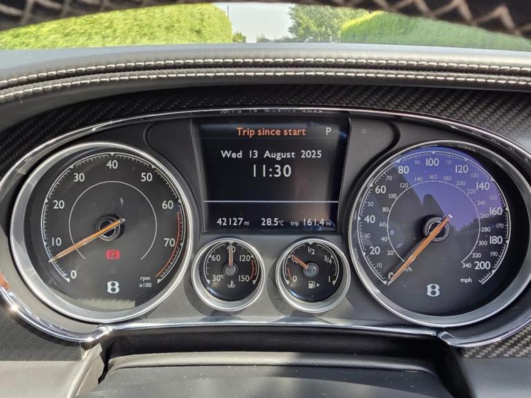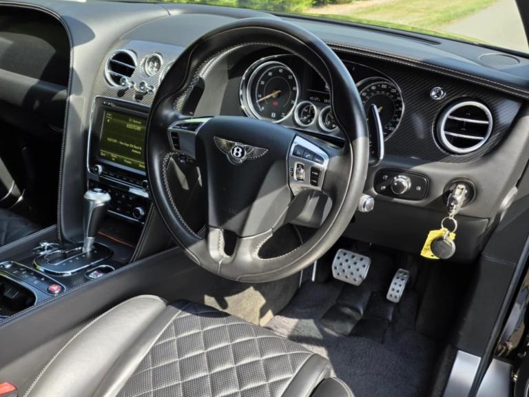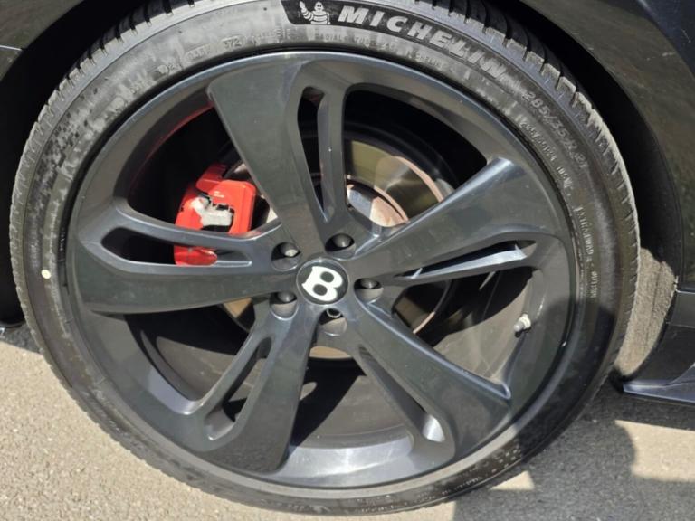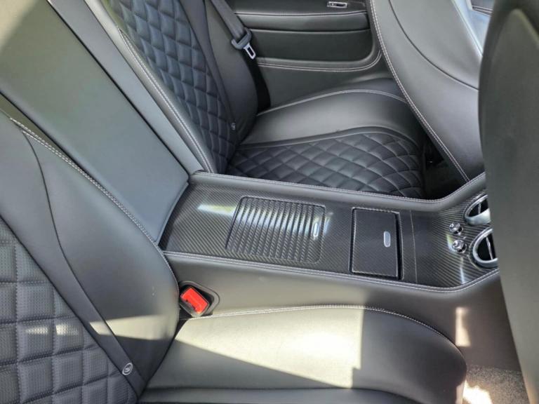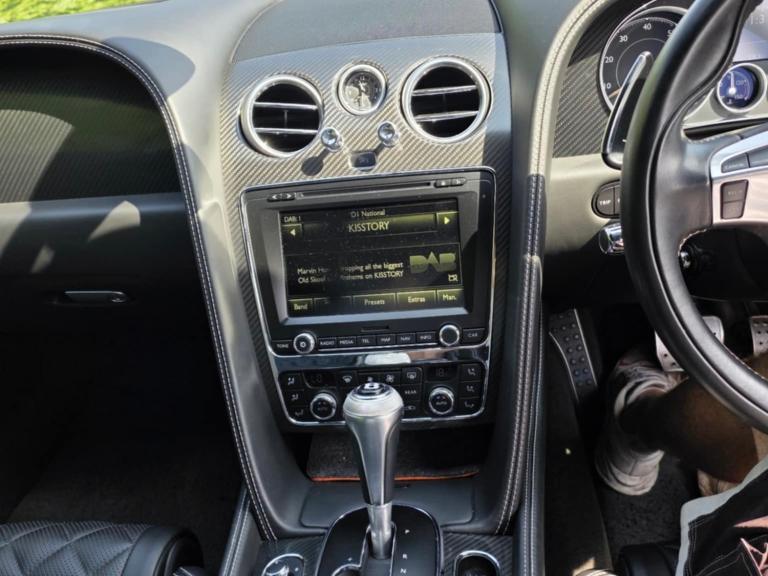 Curtain airbags, Door open warning light, Driver/front passenger airbag, Drivers knee airbag, Front and rear thorax airbag system, Front passenger airbag deactivation, Seatbelt warning, Side airbags, Tyre pressure monitoring system, Alarm/immobiliser, Anti-theft wheel bolts, Auto door lock when driving, Keyless entry, Keyless ignition, Tracker system, Ultrasonic alarm, Anti-lock brakes, Brake assist function, Electronic parking brake, Electronic Stability Programme, Emergency brake force distribution, Red brake calipers, Traction control, Body colour door mirrors, Electric/heated/adjustable/folding door mirrors+memory, Electric front windows, Heated rear windscreen, Rain sensor windscreen wipers, Bentley 'jewel' fuel filler cap, Body coloured bumpers, Dark tint radiator shell matrix and lower bumper grille, Metallic paint, Rear diffuser, Retractable rear boot spoiler, Rifled exhaust tailpipes, Bi-Xenon headlights and headlight washers, Dark tinted front & rear lamps, Daytime running lights, Tunnel detection for auto light control, 14 way Electrically adjustable front seats/memory/lumbar control, Front head restraints, Isofix attachments on outer rear seats, Rear head restraints, Seatbelts-colour to match hide, Piano black veneer, Boot carpet in Beluga, Door lights, Footwell illumination, Interior light, Rear courtesy lights, 3 Spoke hide trimmed steering wheel, Centre armrest with storage box, Diamond quilted hide to seat facings and doors and rear quarter panels, Drilled alloy accelerator and brake pedals, Easy entry/electrically adj steering column+memory, Full hide trim upholstery, Full length console with twin front armrest, Illuminated centre console storage, Knurled chrome/hide gear lever, Ski hatch, Steering column mounted gear shift paddles, Multi-zone climate control, Power boot opening and closing, Power latching to all doors for easy entry, Remote boot release, Continuous damping control, Cruise control, Front/rear park distance control, Servotronic speed sensitive power steering, Breitling clock, Infotainment system/satellite navigation, Service indicator, Trip computer, Bluetooth telephone connectivity, Telephone voice dialling, 30gb Hardrive media storage, 8 Speakers, DAB Digital radio, DVD System, iPod connection, Radio/CD, Satellite Radio, Steering wheel mounted controls, 21" Speed dark tint alloy wheels, Tyre repair kit
