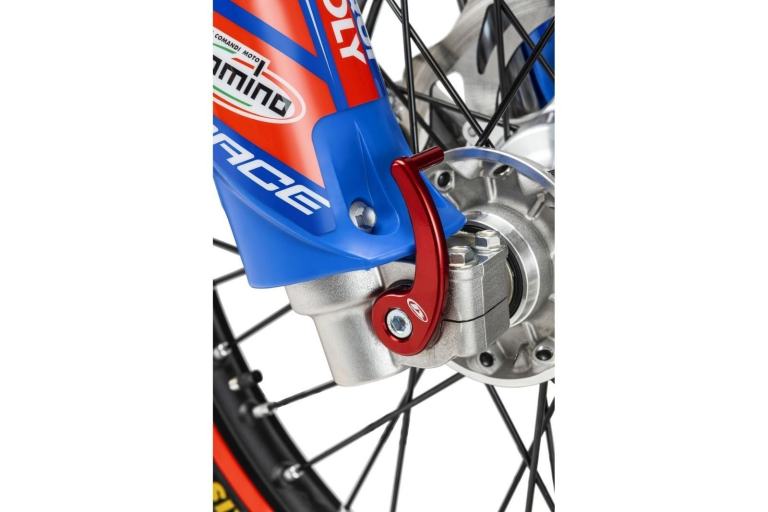 Quick release front axle: immediately recognisable by the red anodised alloy release lever, this component is crucial for saving precious seconds in a race when you need to change a tyre.