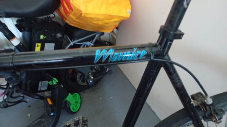 Black frame with blue accents on the wheels and 'Maurice' decal.