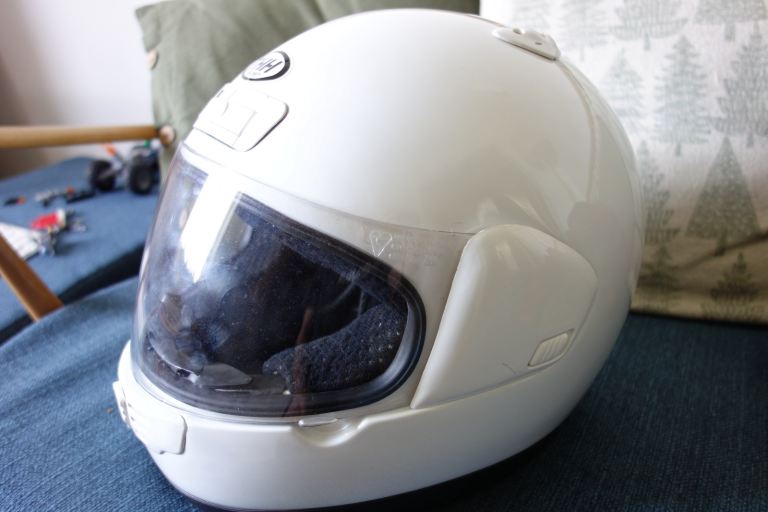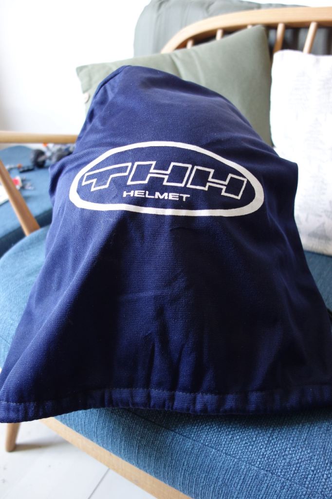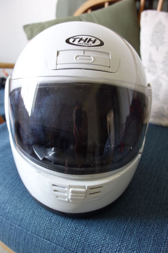 THH T-792 motorcycle helmet, size Large. As new. Bought for a bike I was rebuilding but never got it on the road and never did my test, so this has spent its life in my wardrobe. A couple small marks, one on the visor hinge cover and one on the top. The rubber lip around the base of the helmet has a slight kink from where it looks like it wasn’t quite straight when it was glued in place during manufacture. - front almost centre. see photo. Comes with carry bag
