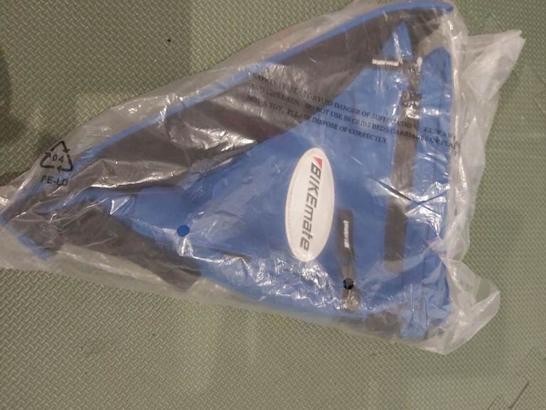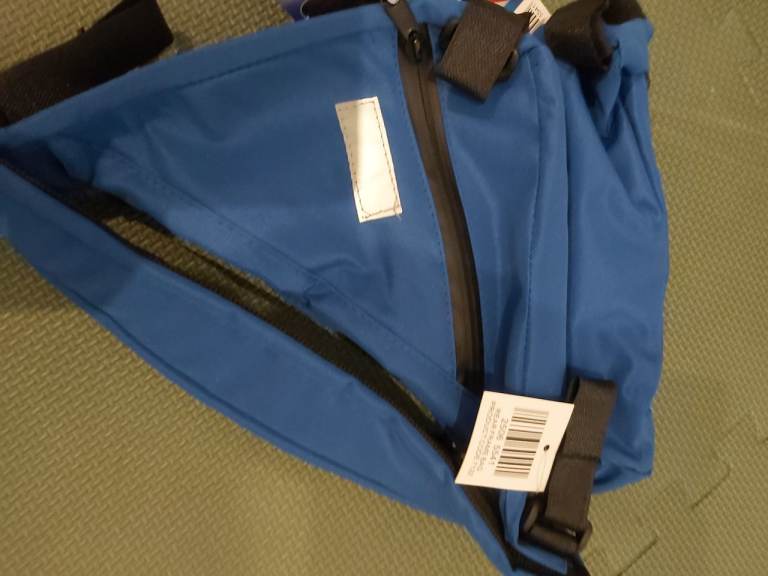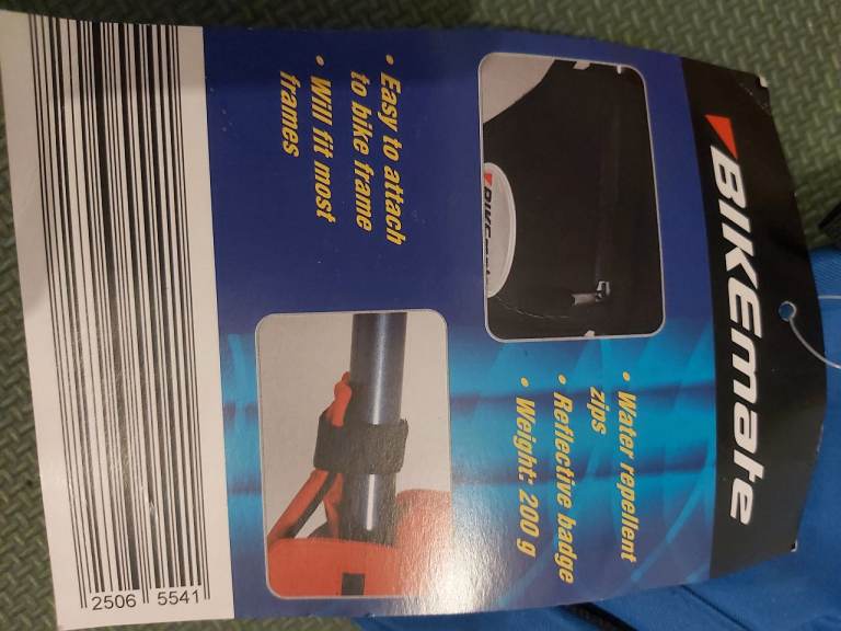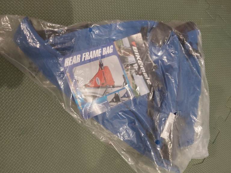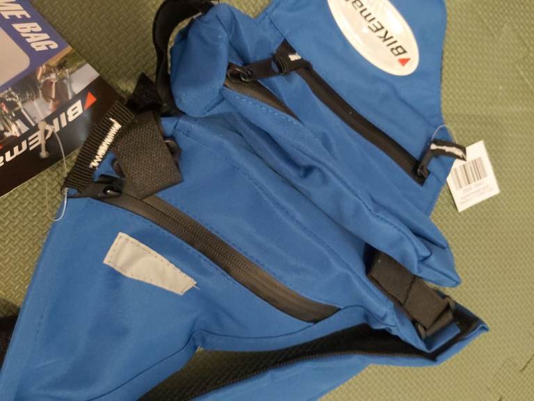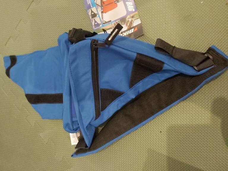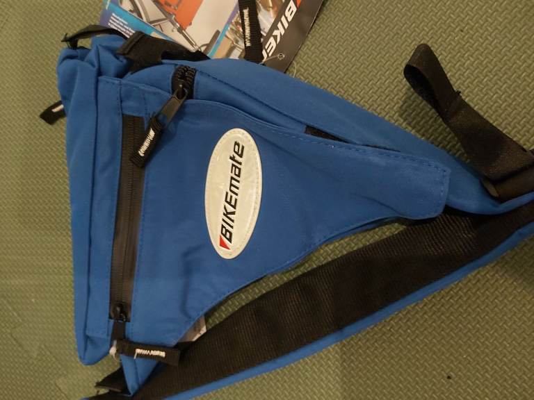 New - Bikemate rear frame cycle carrier bag. Blue coloured triangle shaped bike storage bag. Easy to attach to bike frame using velcro straps. Fits most frames. Water repellent zips. Multiple zipped compartments. Reflective badge. Weight 200g. £10