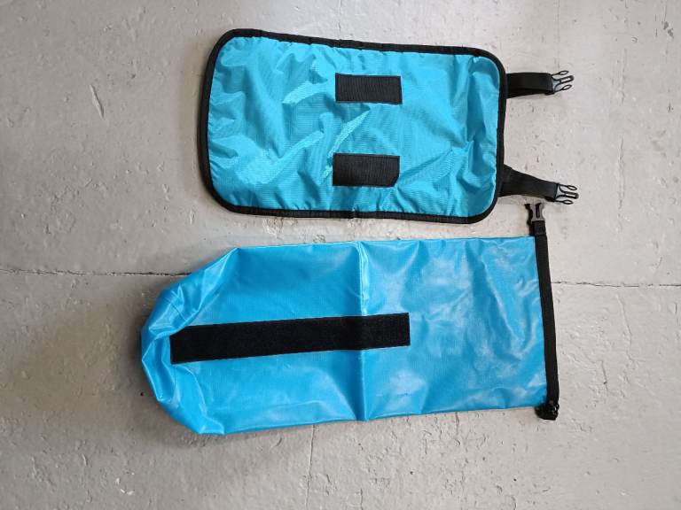 The black harness is designed to attach to the handlebars of a bike while the blue dry bag fits securely inside it.