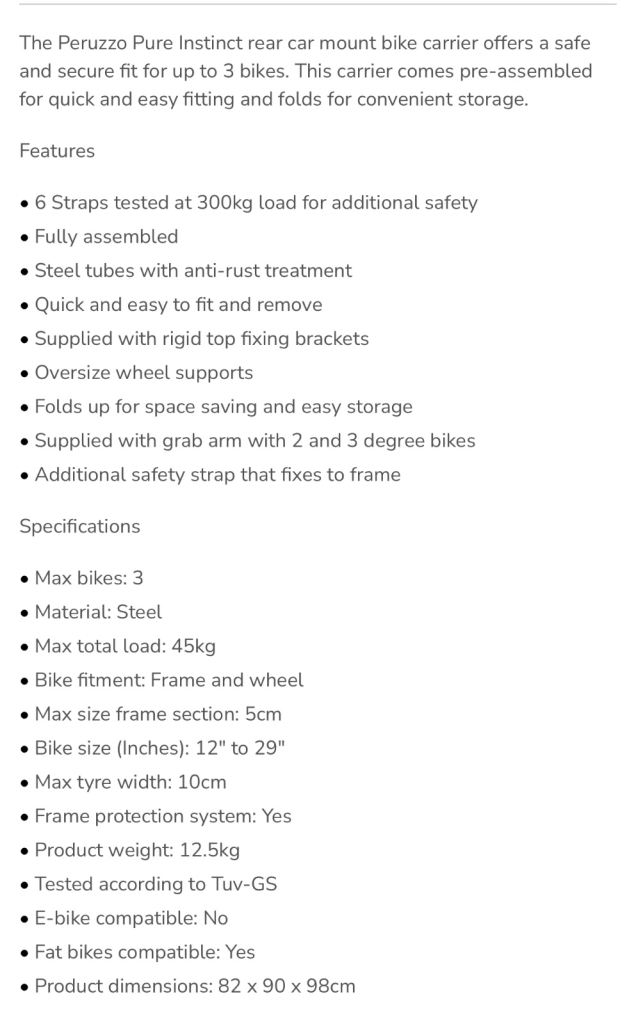 Selling my Peruzzo Pure Instinct 3 Bike Rear Carrier in excellent, like-new condition.