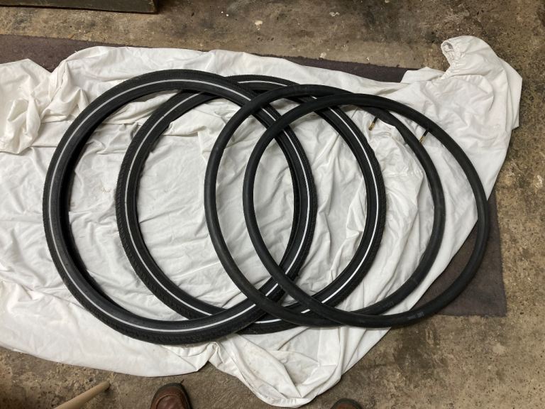 One pair Shimano RS wheels, 700c fitted with unworn, good quality 700x32 Continental Sport tyres. Again,they have had little use and the brake surfaces are unworn. They run straight and true and the bearings are perfect. £30 for the pair.