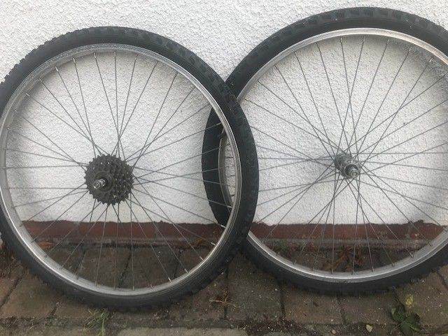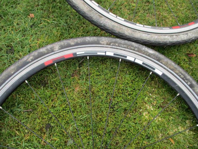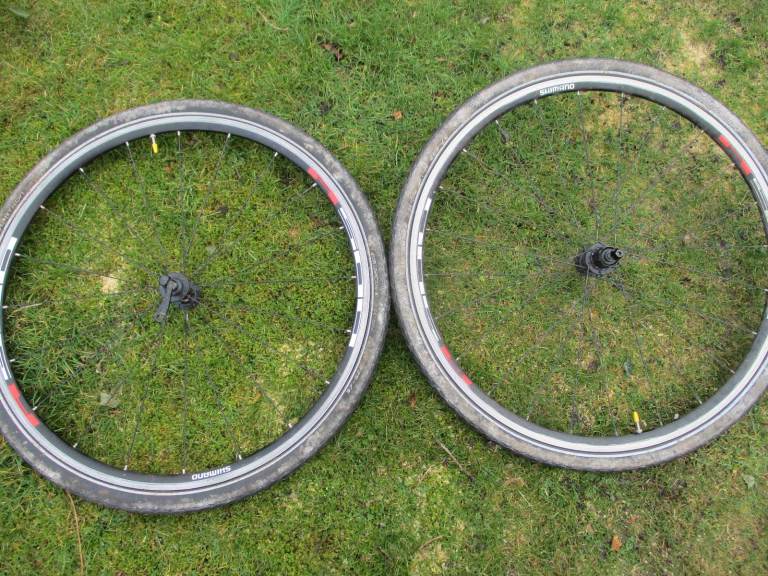 One pair Shimano R500, 700c fitted with excellent quality 700x35 Schwalbe Marathon tyres. These wheels have done little mileage and the brake surfaces are unworn. They run straight and true and the bearings are perfect. I have no further need for them so clearing cheaply at £40 for the pair. I think the tyres cost more than that!