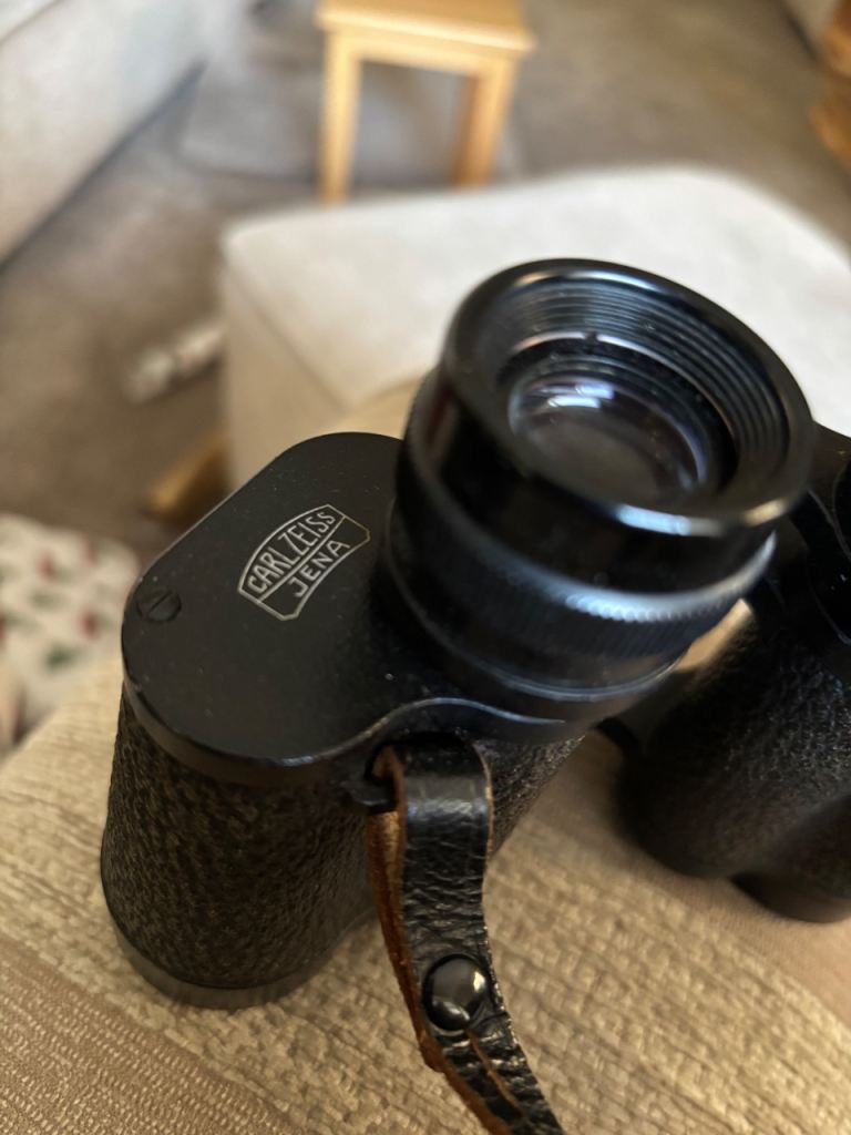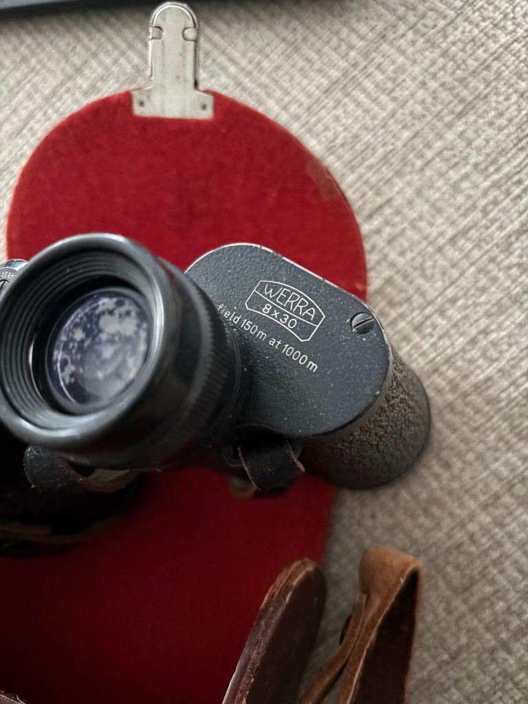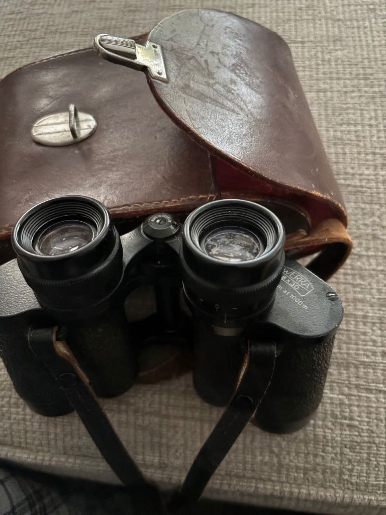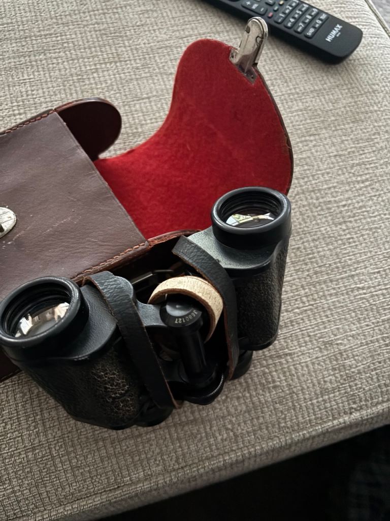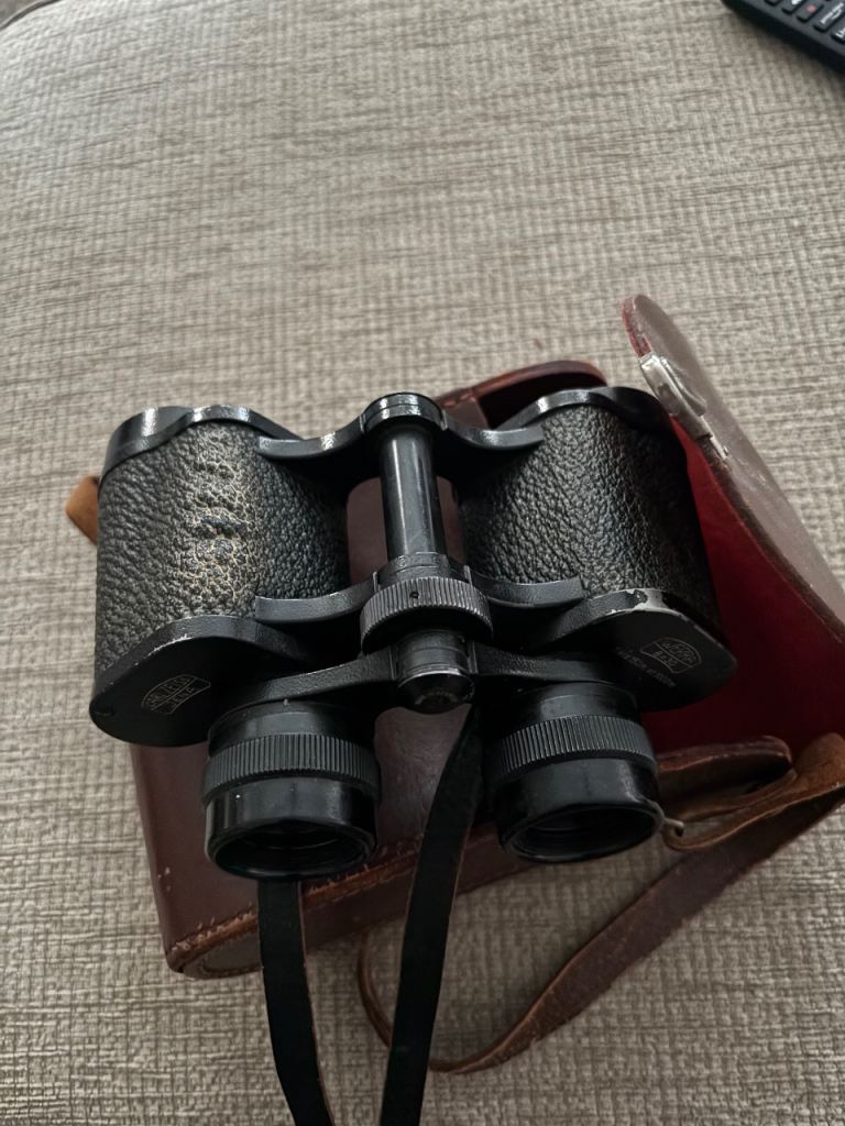 A used pair of binoculars from a quality maker in leather case . Ideal size for bird watching . The coating on one of the eye pieces is apparent but appears to make no difference to the optics , everything is still clear in the sight picture . Prefer collection from S80