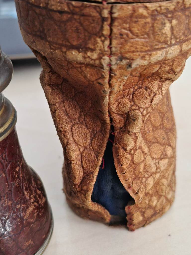 1. Antique French-Style Opera Glasses: Elegant brass and ivory-style finish. In lovely vintage condition, very tactile and display beautifully. 2. Vintage Leather-Bound Binoculars: Classic rugged look. Please note: One eyepiece has some historic damage (see photos),