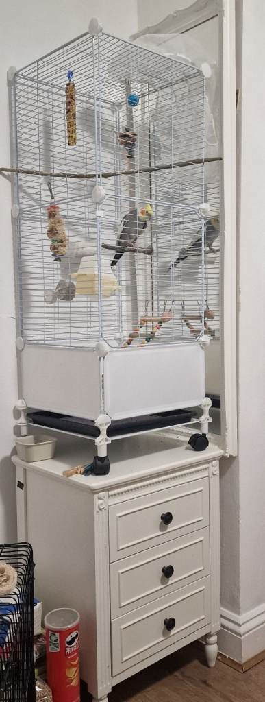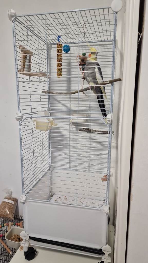 A large 1m cage with the toys and a adorable singer in it. He is young, 1year 6 months old. Is eating from my hands. I had no time to tame him. Like to sing the Cookie song. Very sociable. Recently we have adopted a kitten. Worried about the future life of our lovely Grey. He loves to stay outside the cage soo much.