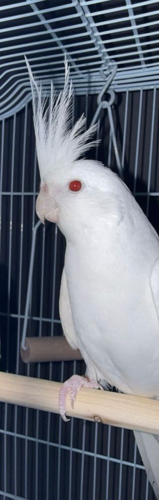 She is healthy and very lovely. She is tamed but still a little shy. Albino cockatiels are rare because of their genetic mutation, which gives them their pure white feathers and red eyes.