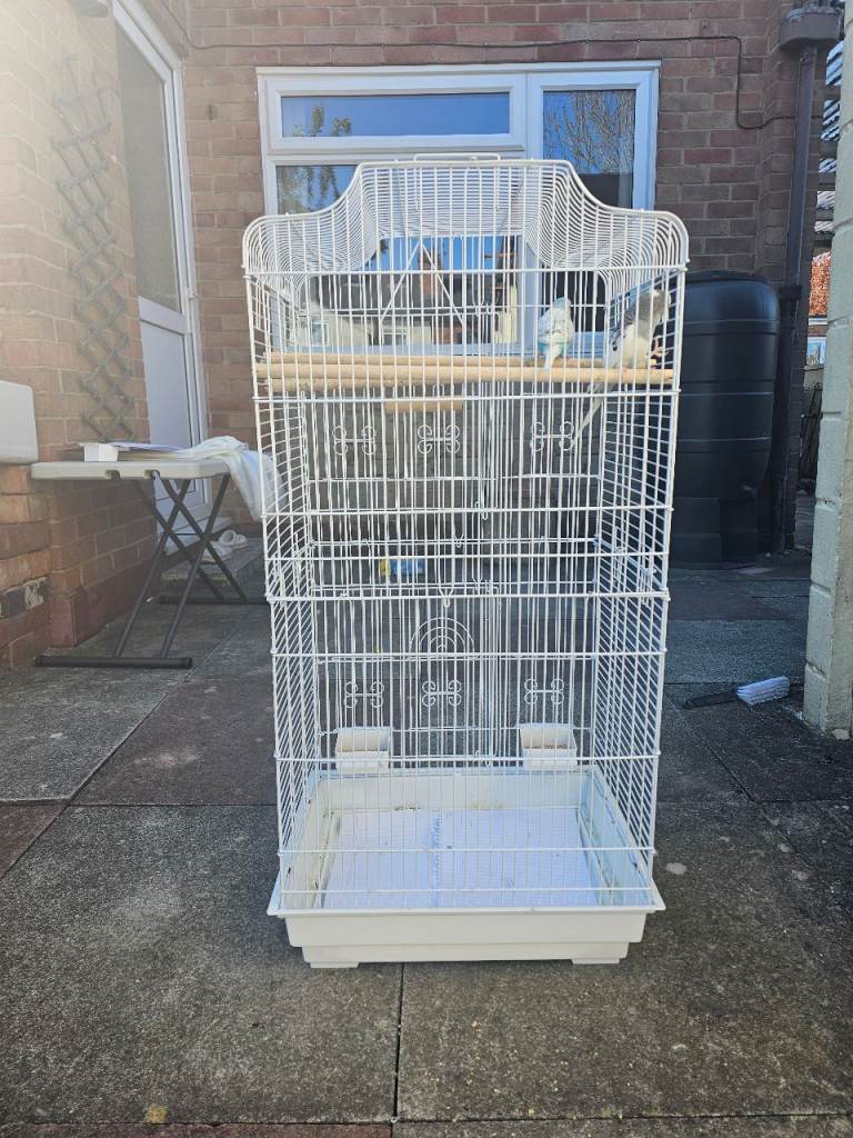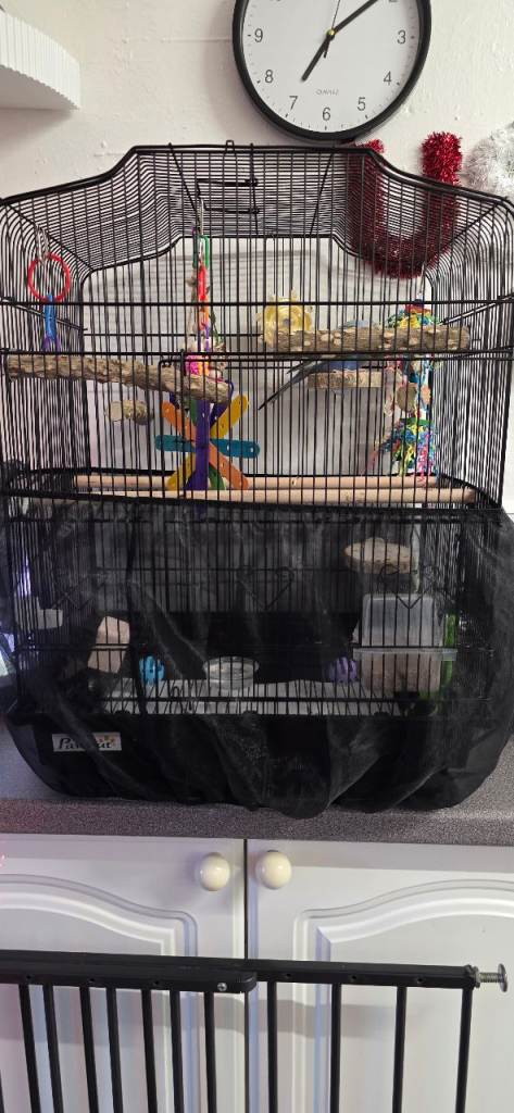 Baby blue budgie for sale. Comes with cage and all accessories. Its semi tame and will sit on your hands. Unsure on the sex. Ready to leave now
