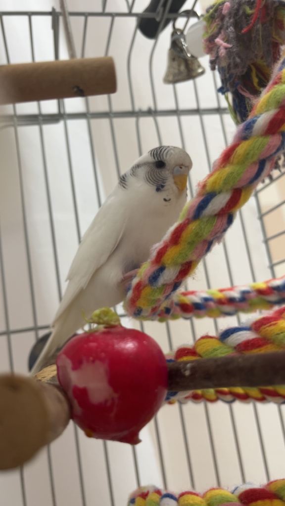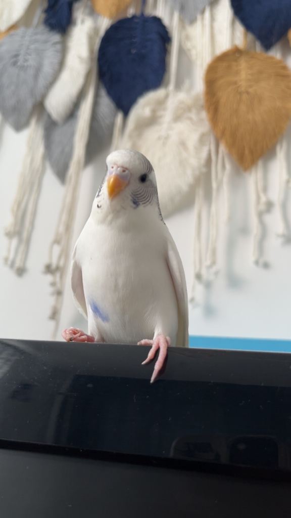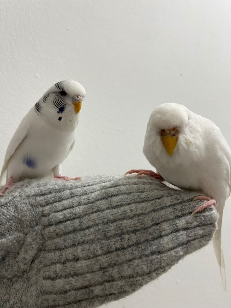 Trouble (white and blue) is extremely active and likes to fly around singing. He loves to sit on your head but isn’t a fan of you forcing him to be held.