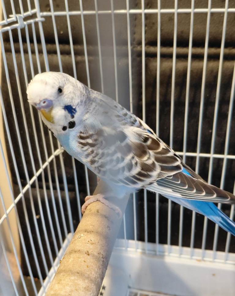 Beautiful blue budgie. Needs rehoming as we are moving house.