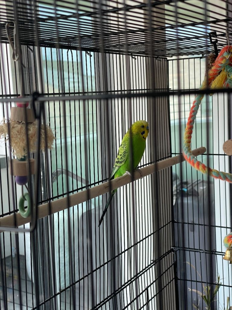 I’m looking for a new, caring home for beautiful budgie. He is healthy, active, and used to being around people.