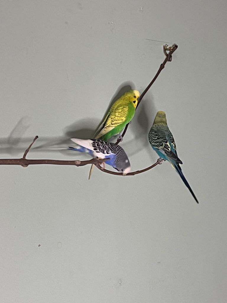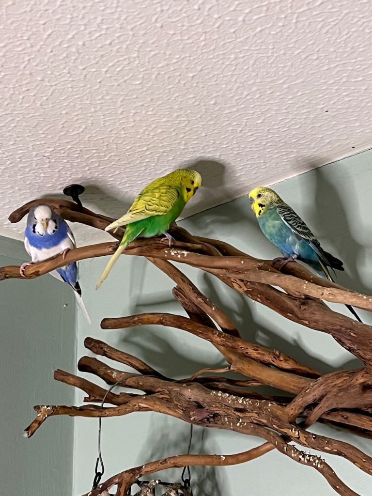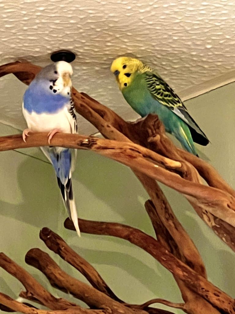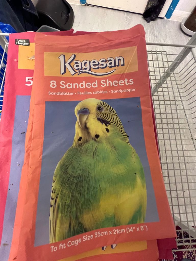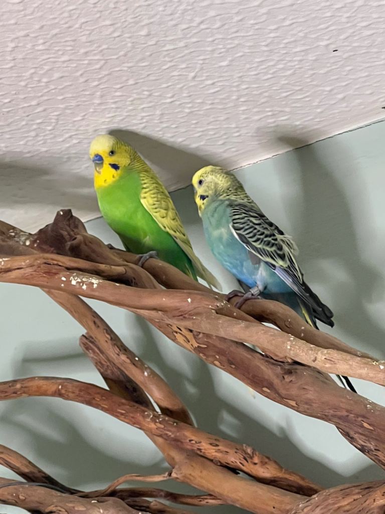 Whole package of 3 lovely budgies and suitable cage. One male is Rainbow. The other two seems to be in love together. About 1 year old. I received Christmas kittens recently at home and budgies would appreciate a more suitable atmosphere. Nest box included and free sanded sheets.