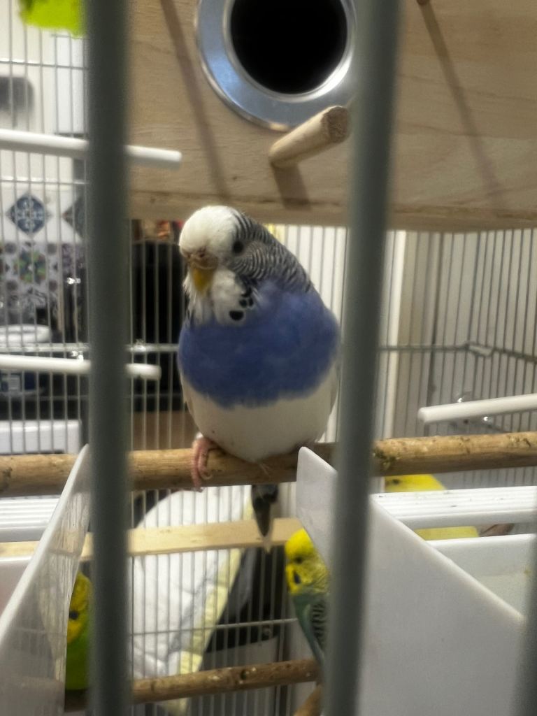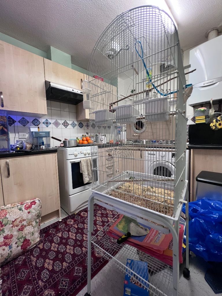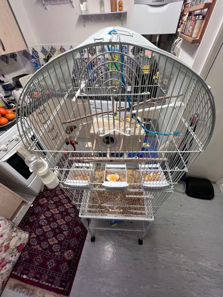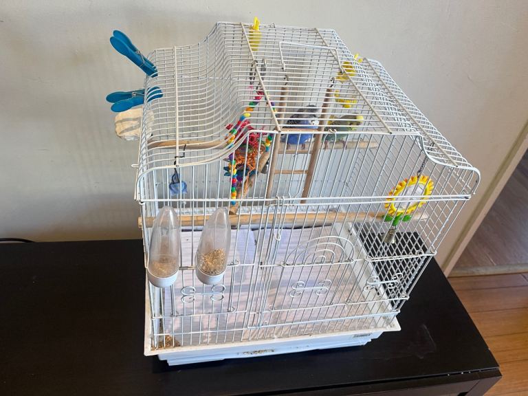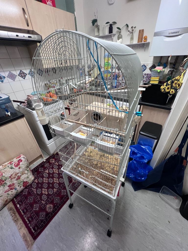 Posting for under a monthBudgies and standing cage. 1 Female 2 x male. Cage in white on the wheels stand.