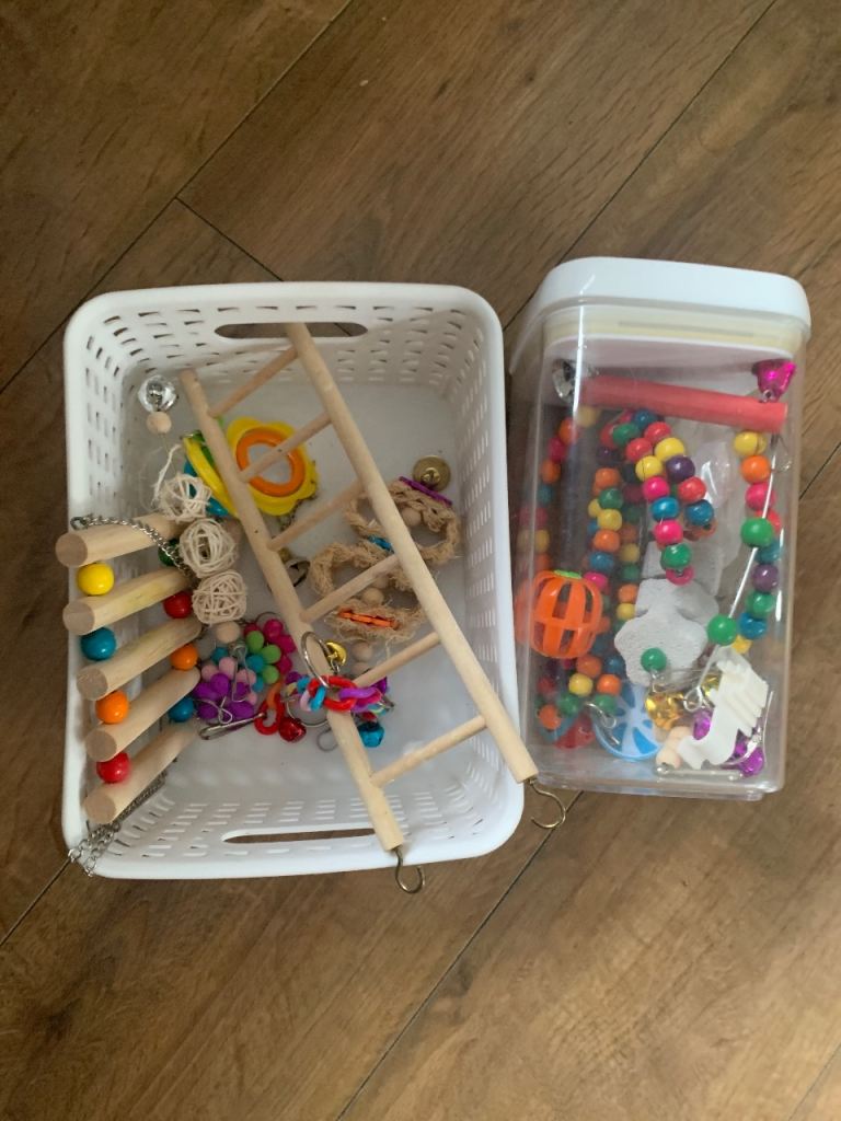 Comes with cage, seeds, millet. Sandpaper, cuttlefish. Calcium block. Toys and spare toys,